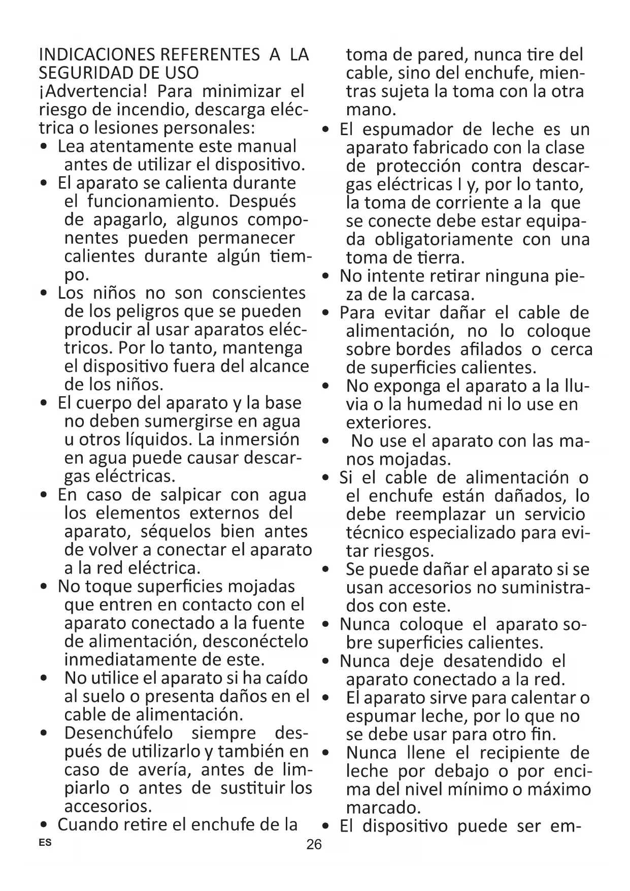 - El espumador de leche es un aparato fabricado con la clase de protección contra descar- gas eléctricas I y, por lo tanto, la toma de corriente a la que se conecte debe estar equipa- da obligatoriamente con una toma de erra.