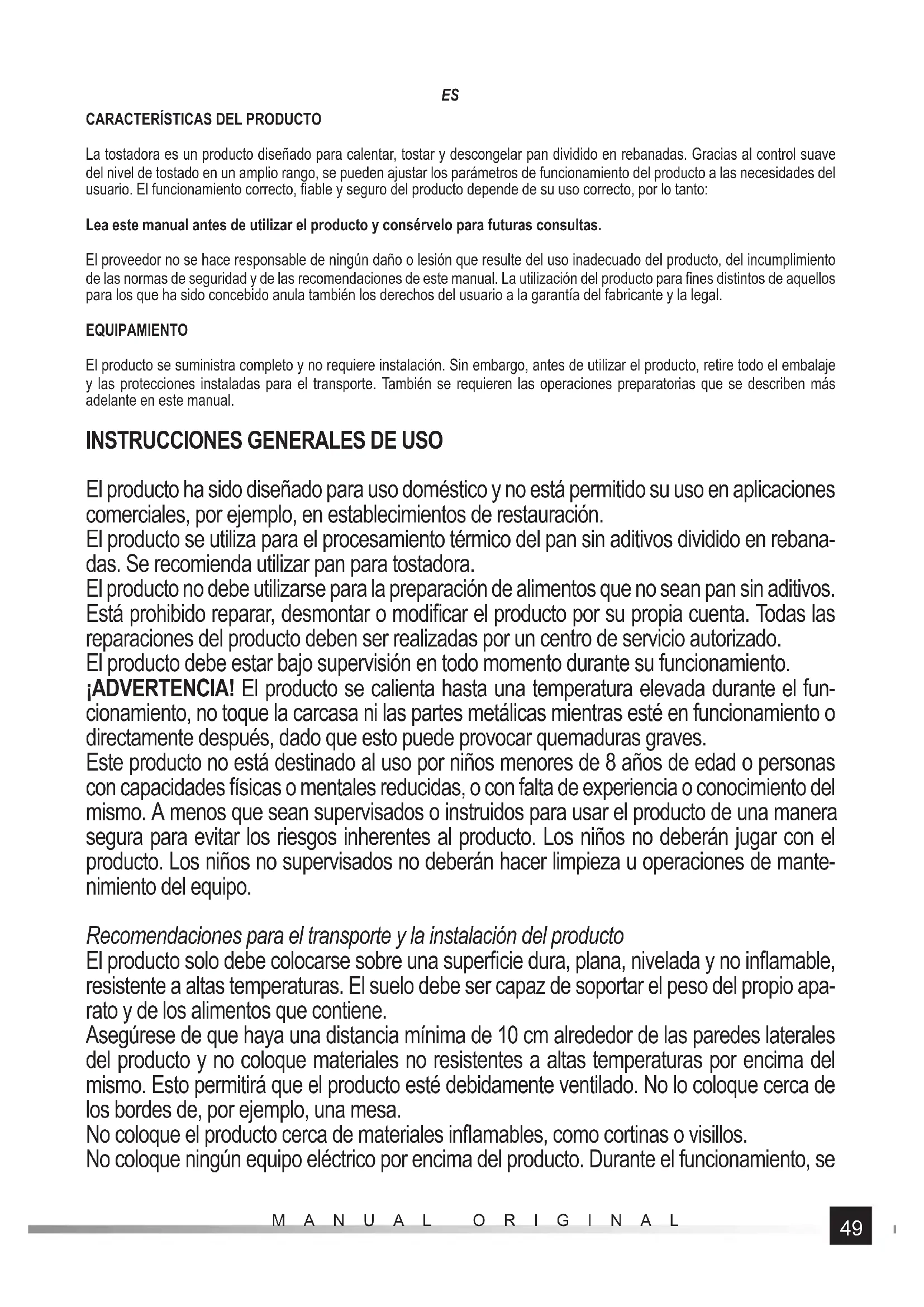 El producto ha sido diseñado para uso doméstico y no está permitido su uso en aplicaciones comerciales, por ejemplo, en establecimientos de restauración. El producto se utiliza para el procesamiento térmico del pan sin aditivos dividido en rebana- das. Se recomienda utilizar pan para tostadora. El producto no debe utilizarse para la preparación de alimentos que no sean pan sin aditivos. Está prohibido reparar, desmontar o modifi car el producto por su propia cuenta. Todas las reparaciones del producto deben ser realizadas por un centro de servicio autorizado. El producto debe estar bajo supervisión en todo momento durante su funcionamiento. ¡ADVERTENCIA! El producto se calienta hasta una temperatura elevada durante el fun- cionamiento, no toque la carcasa ni las partes metálicas mientras esté en funcionamiento o directamente después, dado que esto puede provocar quemaduras graves. Este producto no está destinado al uso por niños menores de 8 años de edad o personas con capacidades físicas o mentales reducidas, o con falta de experiencia o conocimiento del mismo. A menos que sean supervisados o instruidos para usar el producto de una manera segura para evitar los riesgos inherentes al producto. Los niños no deberán jugar con el producto. Los niños no supervisados no deberán hacer limpieza u operaciones de mante- nimiento del equipo. Recomendaciones para el transporte y la instalación del producto El producto solo debe colocarse sobre una superfi cie dura, plana, nivelada y no infl amable, resistente a altas temperaturas. El suelo debe ser capaz de soportar el peso del propio apa- rato y de los alimentos que contiene. Asegúrese de que haya una distancia mínima de 10 cm alrededor de las paredes laterales del producto y no coloque materiales no resistentes a altas temperaturas por encima del mismo. Esto permitirá que el producto esté debidamente ventilado. No lo coloque cerca de los bordes de, por ejemplo, una mesa. No coloque el producto cerca de materiales infl amables, como cortinas o visillos. No coloque ningún equipo eléctrico por encima del producto. Durante el funcionamiento, se50 MANUAL ORIGINAL