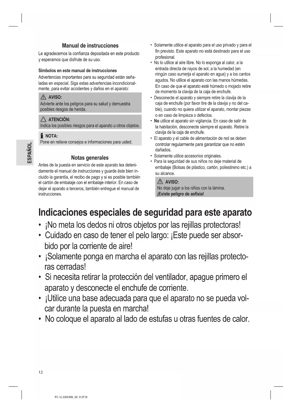 - Para la seguridad de sus niños no deje material de embalaje (Bolsas de plástico, cartón, poliestireno etc.) a su alcance. AVISO: No deje jugar a los niños con la lámina. ¡Existe peligro de asxia! Indicaciones especiales de seguridad para este aparato