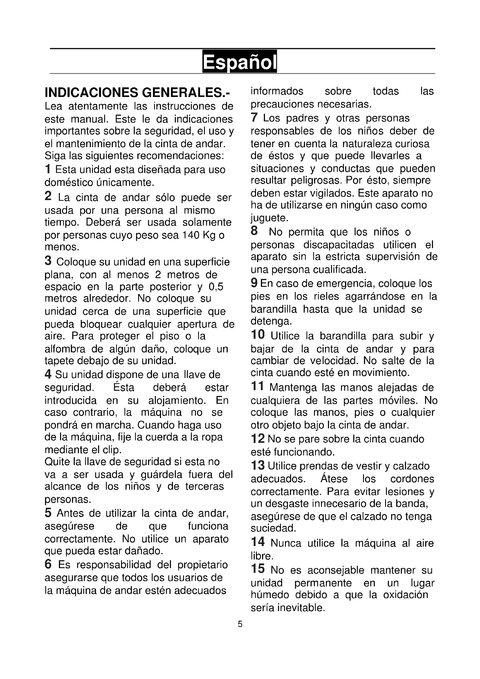 Fig.5 Fig.64 Fig.7 Fig.85 Español INDICACIONES GENERALES.- Lea atentamente las instrucciones de este manual. Este le da indicaciones importantes sobre la seguridad, el uso y el mantenimiento de la cinta de andar. Siga las siguientes recomendaciones: