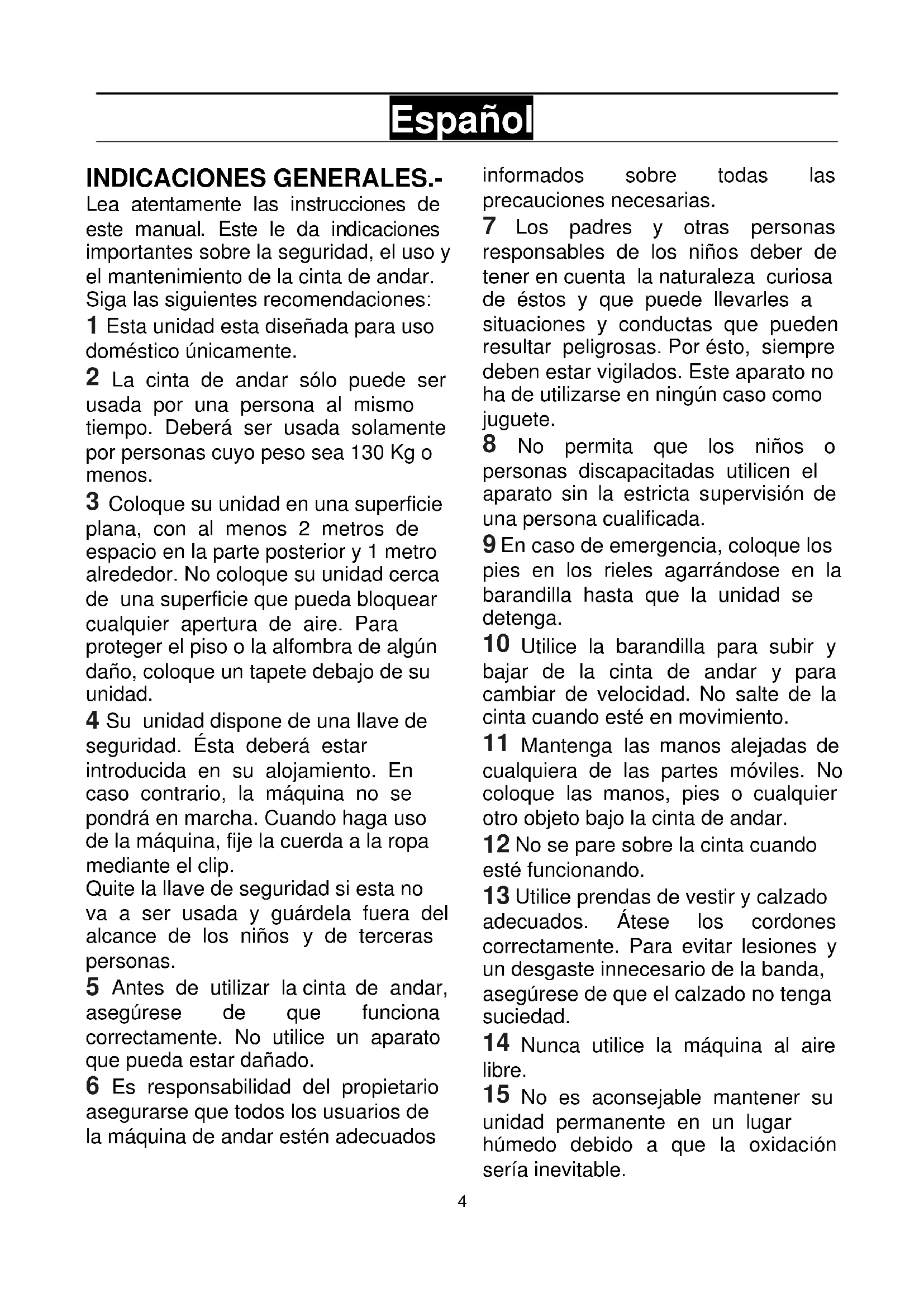 Fig.6 Fig.74 Español INDICACIONES GENERALES.- Lea atentamente las instrucciones de este manual. Este le da indicaciones importantes sobre la seguridad, el uso y el mantenimiento de la cinta de andar. Siga las siguientes recomendaciones: