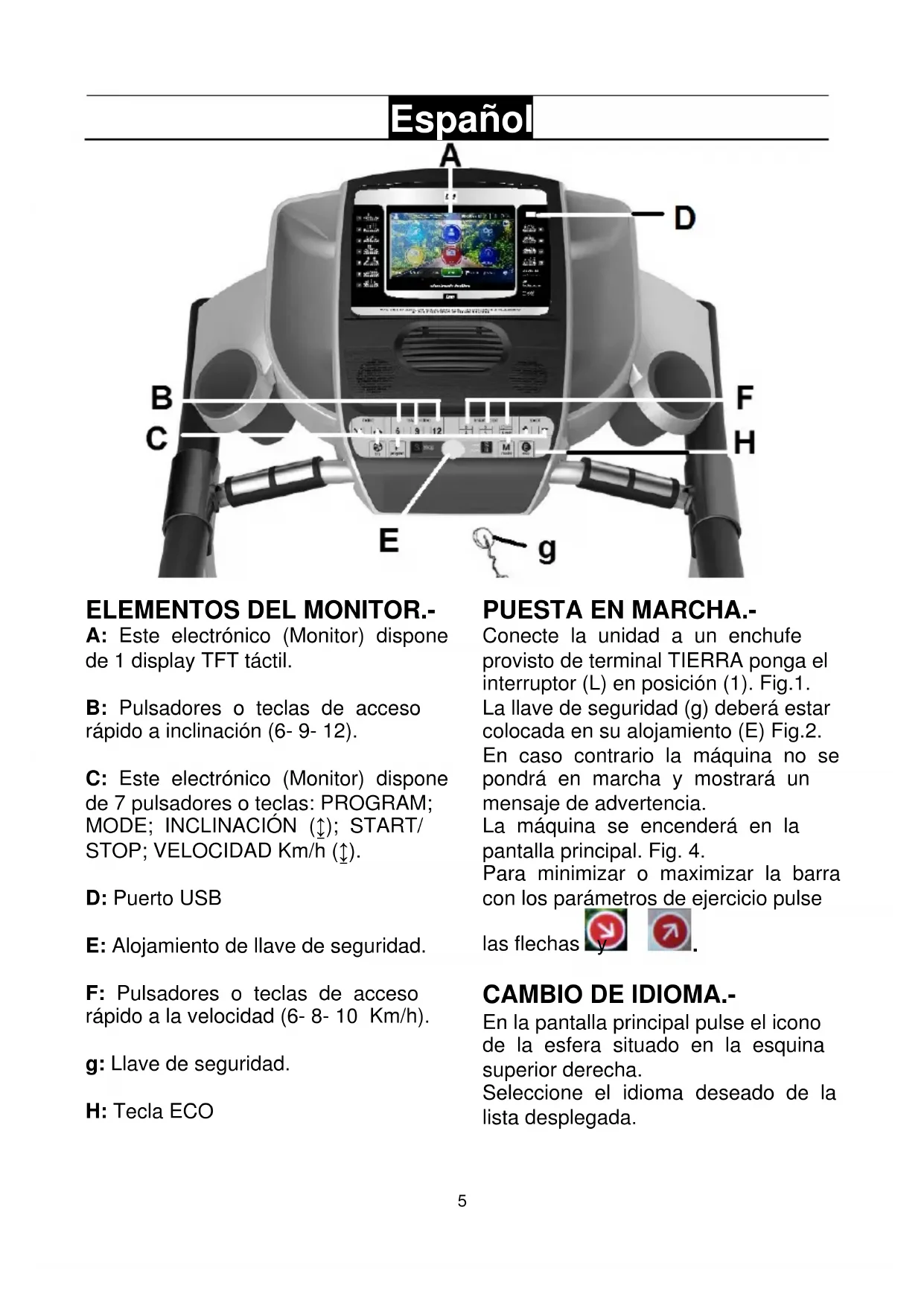 Conecte la unidad a un enchufe provisto de terminal TIERRA ponga el interruptor (L) en posición (1). Fig.1. La llave de seguridad (g) deberá estar colocada en su alojamiento (E) Fig.2. En caso contrario la máquina no se pondrá en marcha y mostrará un mensaje de advertencia. La máquina se encenderá en la pantalla principal. Fig. 4. Para minimizar o maximizar la barra con los parámetros de ejercicio pulse las flechas y