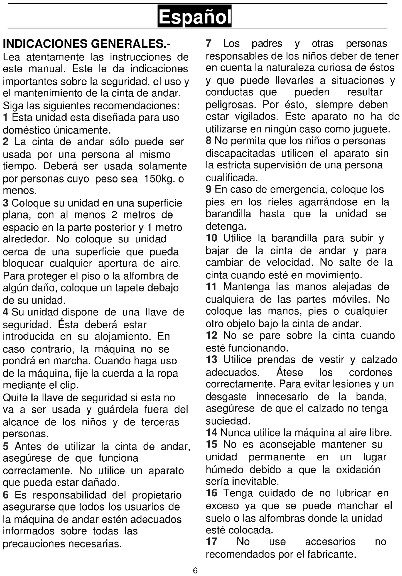 Fig.7 Fig.86 Español INDICACIONES GENERALES.- Lea atentamente las instrucciones de este manual. Este le da indicaciones importantes sobre la seguridad, el uso y el mantenimiento de la cinta de andar. Siga las siguientes recomendaciones: 1 Esta unidad esta diseñada para uso doméstico únicamente. 2 La cinta de andar sólo puede ser usada por una persona al mismo tiempo. Deberá ser usada solamente por personas cuyo peso sea 150kg. o menos. 3 Coloque su unidad en una superficie plana, con al menos 2 metros de espacio en la parte posterior y 1 metro alrededor. No coloque su unidad cerca de una superficie que pueda bloquear cualquier apertura de aire. Para proteger el piso o la alfombra de algún daño, coloque un tapete debajo de su unidad. 4 Su unidad dispone de una llave de seguridad. Ésta deberá estar introducida en su alojamiento. En caso contrario, la máquina no se pondrá en marcha. Cuando haga uso de la máquina, fije la cuerda a la ropa mediante el clip. Quite la llave de seguridad si esta no va a ser usada y guárdela fuera del alcance de los niños y de terceras personas. 5 Antes de utilizar la cinta de andar, asegúrese de que funciona correctamente. No utilice un aparato que pueda estar dañado. 6 Es responsabilidad del propietario asegurarse que todos los usuarios de la máquina de andar estén adecuados informados sobre todas las precauciones necesarias. 7 Los padres y otras personas responsables de los niños deber de tener en cuenta la naturaleza curiosa de éstos y que puede llevarles a situaciones y conductas que pueden resultar peligrosas. Por ésto, siempre deben estar vigilados. Este aparato no ha de utilizarse en ningún caso como juguete. 8 No permita que los niños o personas discapacitadas utilicen el aparato sin la estricta supervisión de una persona cualificada. 9 En caso de emergencia, coloque los pies en los rieles agarrándose en la barandilla hasta que la unidad se detenga. 10 Utilice la barandilla para subir y bajar de la cinta de andar y para cambiar de velocidad. No salte de la cinta cuando esté en movimiento. 11 Mantenga las manos alejadas de cualquiera de las partes móviles. No coloque las manos, pies o cualquier otro objeto bajo la cinta de andar. 12 No se pare sobre la cinta cuando esté funcionando. 13 Utilice prendas de vestir y calzado adecuados. Átese los cordones correctamente. Para evitar lesiones y un desgaste innecesario de la banda, asegúrese de que el calzado no tenga suciedad. 14 Nunca utilice la máquina al aire libre. 15 No es aconsejable mantener su unidad permanente en un lugar húmedo debido a que la oxidación sería inevitable. 16 Tenga cuidado de no lubricar en exceso ya que se puede manchar el suelo o las alfombras donde la unidad esté colocada. 17 No use accesorios no recomendados por el fabricante.7