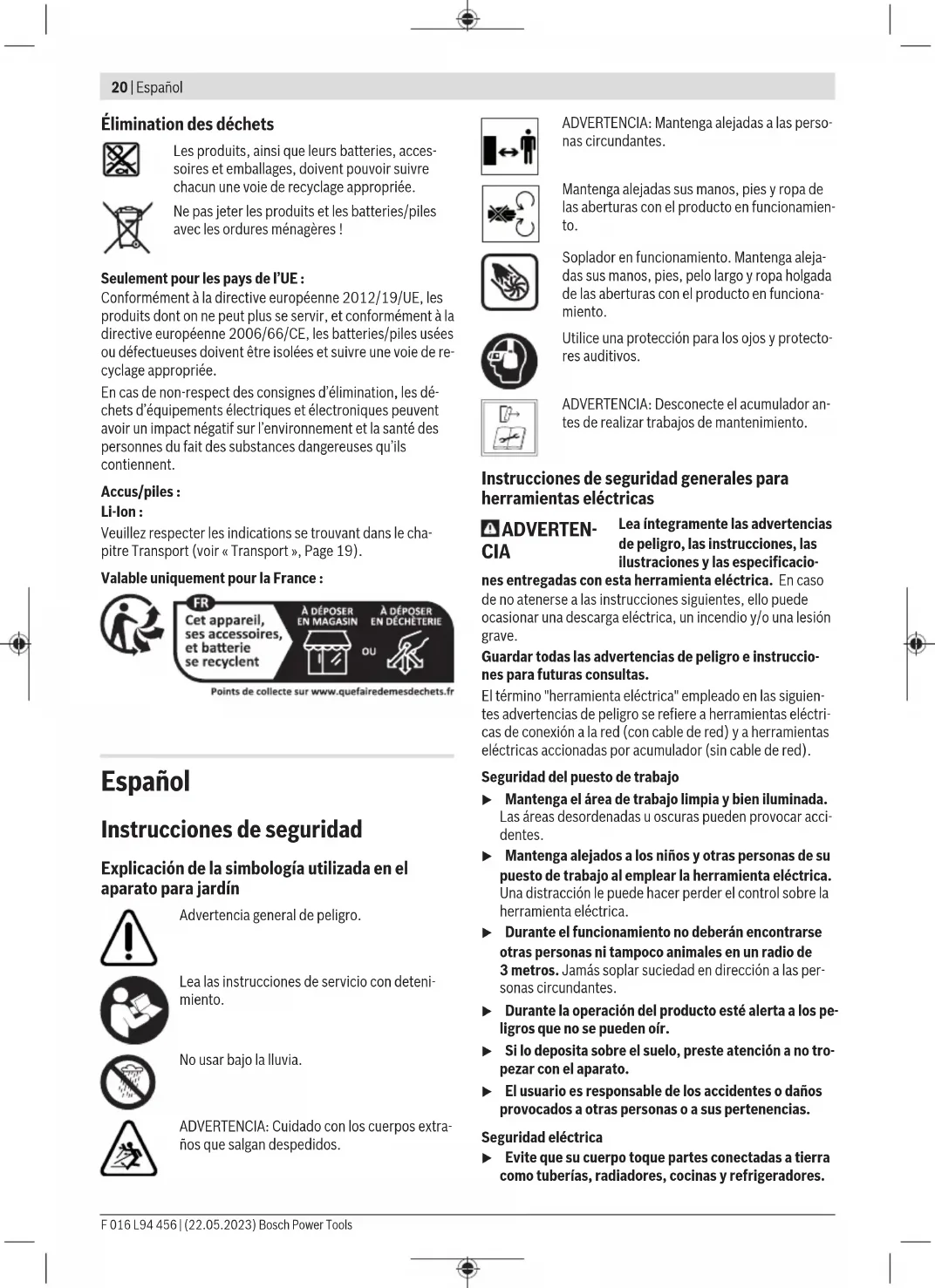Symboles Les symboles suivants sont importants pour pouvoir lire et mieux comprendre le mode d’emploi. Mémoriser ces sym- boles et leur signification. L’interprétation correcte des sym- boles vous permettra de mieux utiliser l’outil en toute sécuri- té. Symbole Signification Direction de déplacement Mise en marche Arrêt CLICK! Bruit audible Accessoires Dépistage de défauts Le tableau suivant montre les types de pannes et indique comment y remédier si la machine ne fonctionne pas correctement. Si malgré cela le problème ne se laisse pas localiser et résoudre, contacter votre Service Après-Vente. Attention: Avant de procéder au dépannage, éteindre l’appareil. Attention: En cas d’accident ou de bris d’outil, arrêter immédiatement la machine et retirer la batterie. Symptôme Cause possible Remède L’outil de jardin ne fonctionne pas Batterie déchargée Recharger la batterie La batterie n’a pas été correctement mise en place Monter la batterie correctement (voir figure C) F 016 L94 456 | (22.05.2023) Bosch Power ToolsFrançais | 19 Symptôme Cause possible Remède La batterie est trop chaude/trop froide Laissez refroidir/chauffer la batterie. Toujours dé- marrer le produit à bas régime Outil de jardin défectueux Contactez le Service Après-Vente L’outil de jardin fonc- tionne par intermit- tence Interrupteur Marche/Arrêt défectueux Contacter le Service Après-Vente Régulateur de la vitesse du débit d’air défectueux Contacter le Service Après-Vente Vibrations/bruits ex- cessifs Outil de jardin défectueux Contactez le Service Après-Vente Autonomie trop faible par charge de la batte- rie La batterie n’a pas été utilisée pour une période assez longue ou seulement pour une courte durée Charger la batterie complètement La batterie est défectueuse Remplacer la batterie L’outil de jardin ne souffle pas Buse bloquée Dégager la buse Débit d’air réduit Entrée d’air bloquée Dégager l’entrée d’air Batterie trop froide Toujours démarrer le produit à bas régime La buse ne se laisse pas monter Faux montage Monter la buse correctement (voir figure B) Entretien et Service Après‑Vente Entretien, nettoyage et stockage u Ne confiez la réparation de vos produits qu’à un répa- rateur qualifié utilisant uniquement des pièces de re- change d’origine. Ceci permet de préserver la sécurité du produit. u Ne jamais effectuer d'opération d'entretien sur des blocs de batteries endommagés. Il convient que l'entre- tien des blocs de batteries ne soit effectué que par le fa- bricant ou les fournisseurs de service autorisés. Entretien, nettoyage et stockage Enlever les saletés à l’aide d’un chiffon humidifié. Ne jamais utiliser de solvants. Veiller à ce que le produit ne soit pas aspergé d’eau. Veiller à ce que le produit ne soit pas immergé dans l’eau. Service après-vente et conseil utilisateurs Notre Service après-vente répond à vos questions concer- nant la réparation et l’entretien de votre produit et les pièces de rechange. Vous trouverez des vues éclatées et des infor- mations sur les pièces de rechange sur le site : www.bosch-pt.com L’équipe de conseil utilisateurs Bosch se tient à votre dispo- sition pour répondre à vos questions concernant nos pro- duits et leurs accessoires. Pour toute demande de renseignement ou toute commande de pièces de rechange, précisez impérativement la réfé- rence à 10chiffres figurant sur l’étiquette signalétique du produit. France Réparer un outil Bosch n’a jamais été aussi simple, et ce, en moins de 5 jours, grâce à SAV DIRECT, notre formulaire de retour en ligne que vous trouverez sur notre site internet www.bosch-pt.fr à la rubrique Services. Vous y trouverez également notre boutique de pièces détachées en ligne où vous pouvez passer directement vos commandes. Vous êtes un utilisateur, contactez : Le Service Clientèle Bosch Outillage Electroportatif Tel.: 0970821299 (Numéro non surtaxé au prix d'un ap- pel local) E-Mail : sav.outillage-electroportatif@fr.bosch.com Vous êtes un revendeur, contactez : Robert Bosch (France) S.A.S. Service Après-Vente Electroportatif 126, rue de Stalingrad 93705 DRANCY Cédex Tel. : (01) 43119006 E-Mail : sav-bosch.outillage@fr.bosch.com Vous trouverez d'autres adresses du service après-vente sous: www.bosch-pt.com/serviceaddresses Transport Les accus Lithium-ion recommandés sont soumis à la régle- mentation relative au transport de matières dangereuses. Pour le transport sur route par l’utilisateur, aucune autre me- sure n’a besoin d’être prise. Lors d’une expédition par un tiers (parex.transport aérien ou entreprise de transport), des mesures spécifiques doivent être prises concernant l’emballage et le marquage. Pour la préparation de l’envoi, faites-vous conseiller par un expert en transport de matières dangereuses. N’expédiez que des accus dont le boîtier n’est pas endom- magé. Recouvrez les contacts non protégés et emballez l’ac- cu de manière à ce qu’il ne puisse pas se déplacer dans l’em- ballage. Veuillez également respecter les réglementations supplémentaires éventuellement en vigueur. Bosch Power Tools F 016 L94 456 | (22.05.2023)20 | Español Élimination des déchets Les produits, ainsi que leurs batteries, acces- soires et emballages, doivent pouvoir suivre chacun une voie de recyclage appropriée. Ne pas jeter les produits et les batteries/piles avec les ordures ménagères ! Seulement pour les pays de l’UE: Conformément à la directive européenne 2012/19/UE, les produits dont on ne peut plus se servir, et conformément à la directive européenne 2006/66/CE, les batteries/piles usées ou défectueuses doivent être isolées et suivre une voie de re- cyclage appropriée. En cas de non-respect des consignes d’élimination, les dé- chets d’équipements électriques et électroniques peuvent avoir un impact négatif sur l’environnem