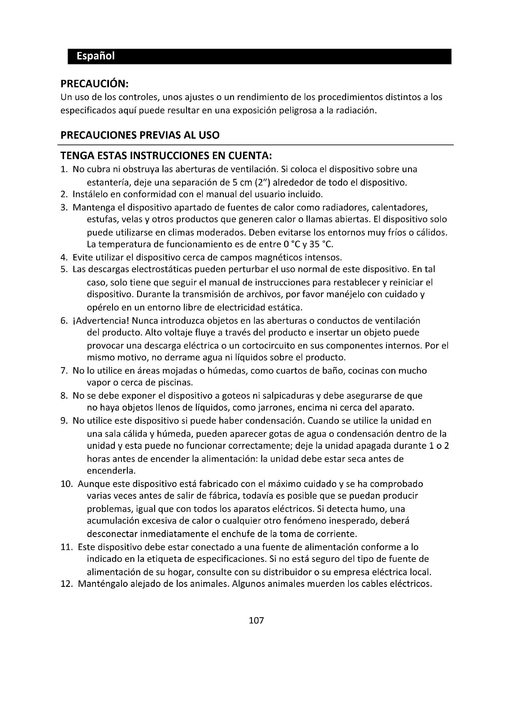 1. No cubra ni obstruya las aberturas de ventilación. Si coloca el dispositivo sobre una