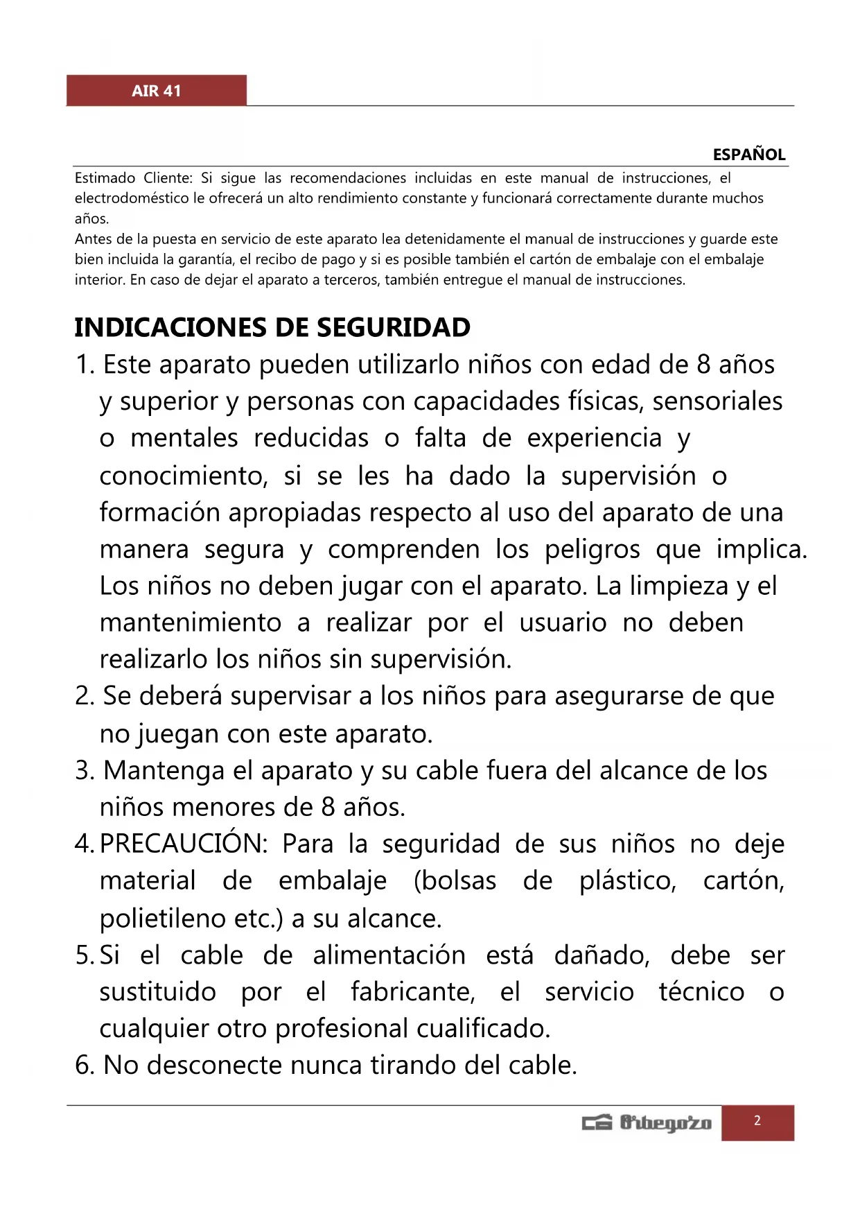 MANUAL DE USUARIO AIR 41 Orbegozo