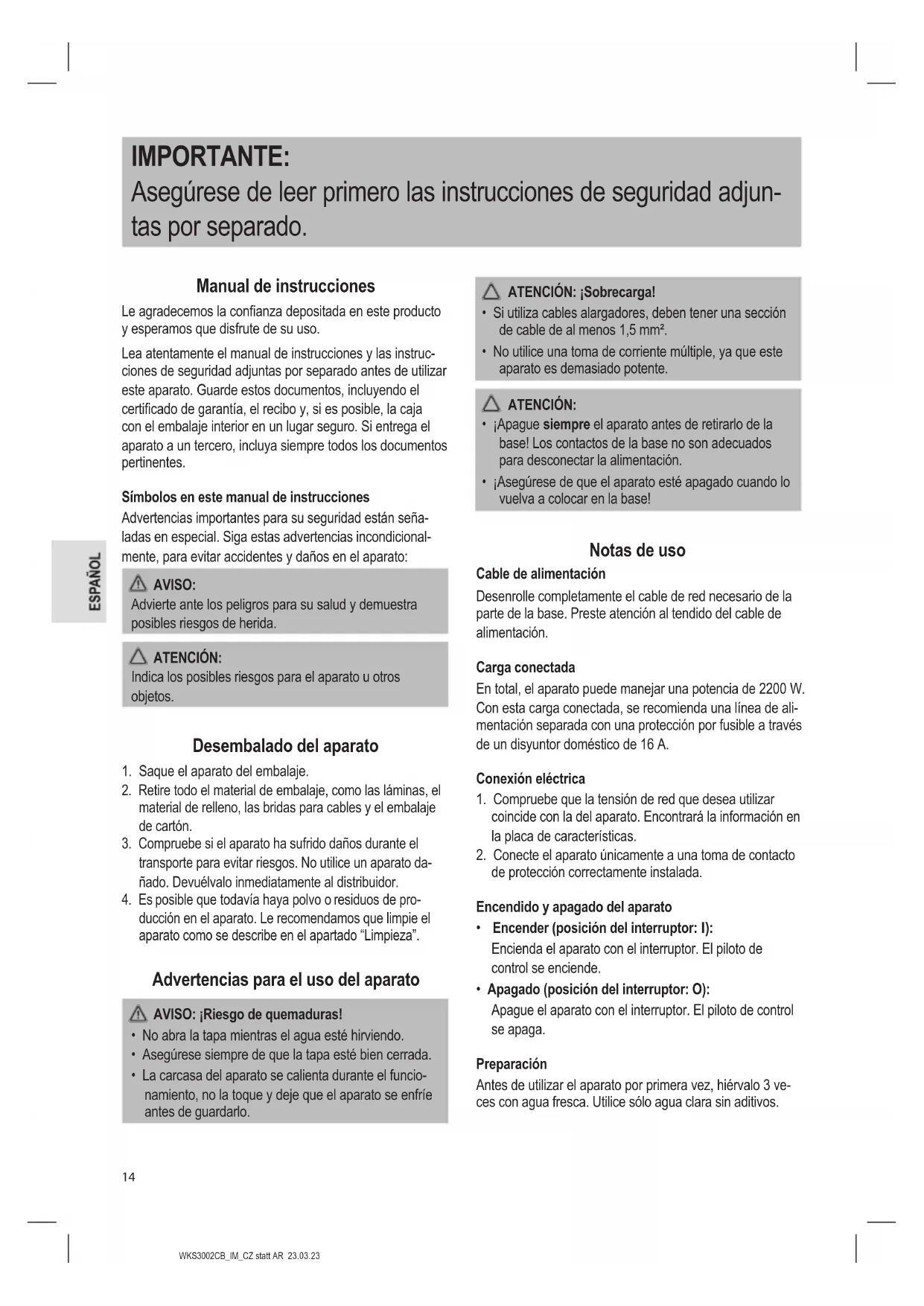 - Apagado (posición del interruptor: O): Apague el aparato con el interruptor. El piloto de control se apaga. Preparación Antes de utilizar el aparato por primera vez, hiérvalo 3 ve- ces con agua fresca. Utilice sólo agua clara sin aditivos.WKS3002CB_IM_CZ statt AR 23.03.23