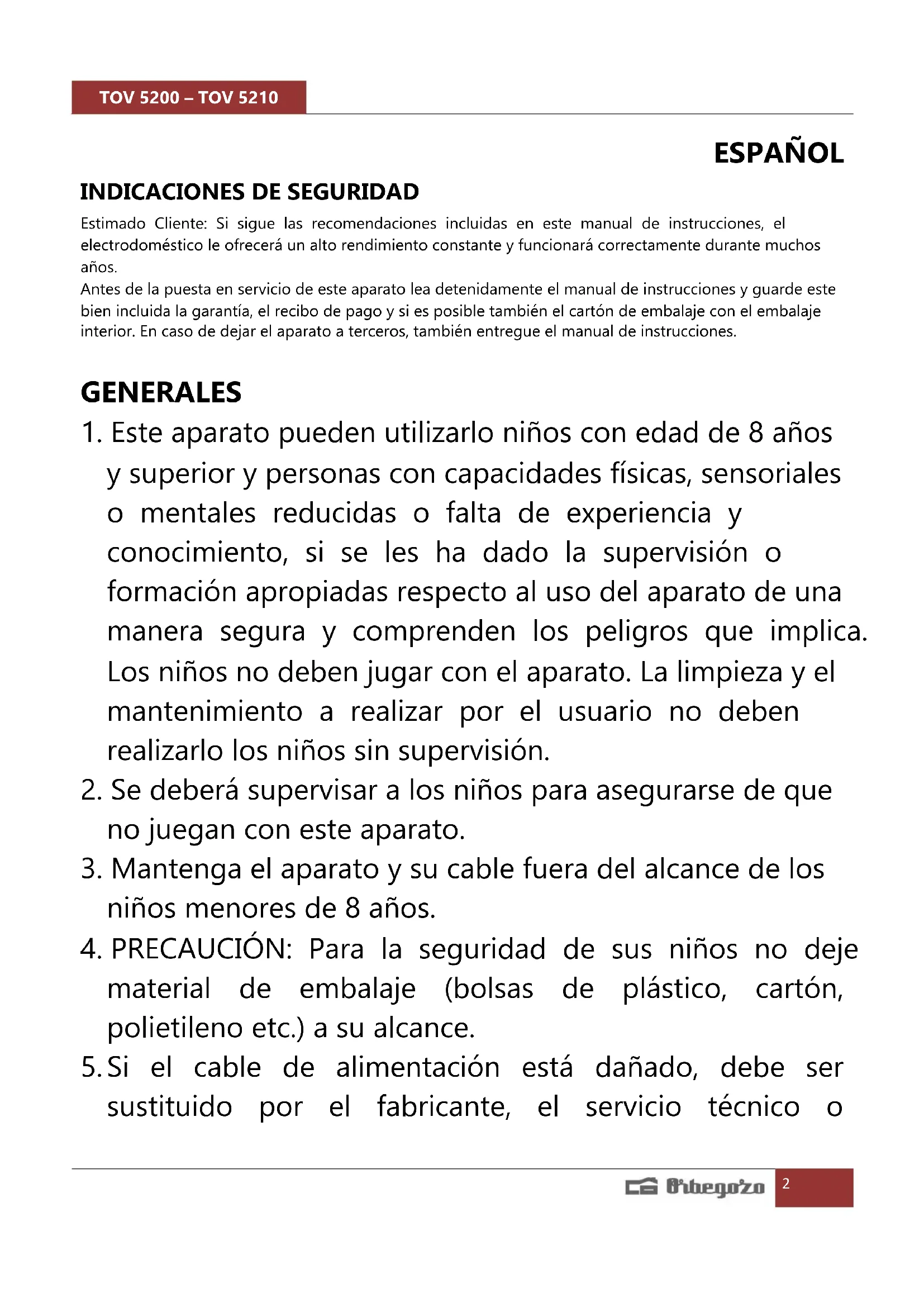 MANUAL DE USUARIO TOV 5210 Orbegozo