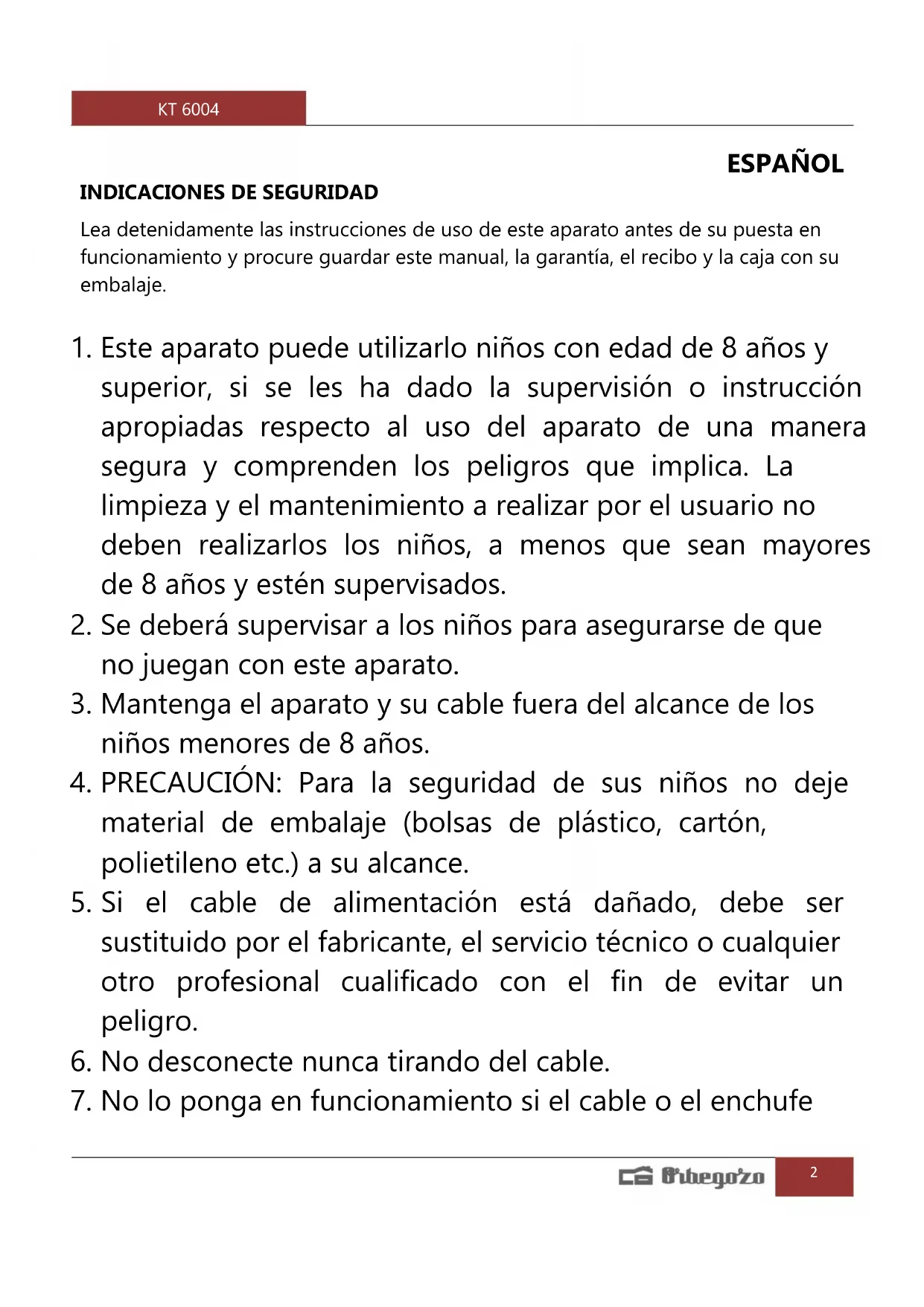 Encuentra gratis el manual del aparato KT 6004 Orbegozo en formato PDF.