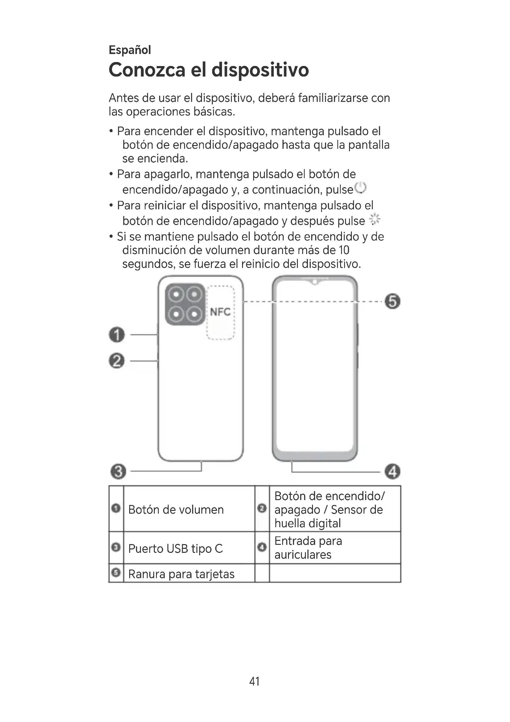 - Si se mantiene pulsado el botón de encendido y de disminución de volumen durante más de 10 segundos, se fuerza el reinicio del dispositivo. Botón de volumen Botón de encendido/ apagado / Sensor de huella digital Pueo USB tipo C Entrada para auriculares Ranura para tarjetas 41• Mantenga el área NFC cerca de los otros dispositivos u objetos cuando utilice la función NFC.