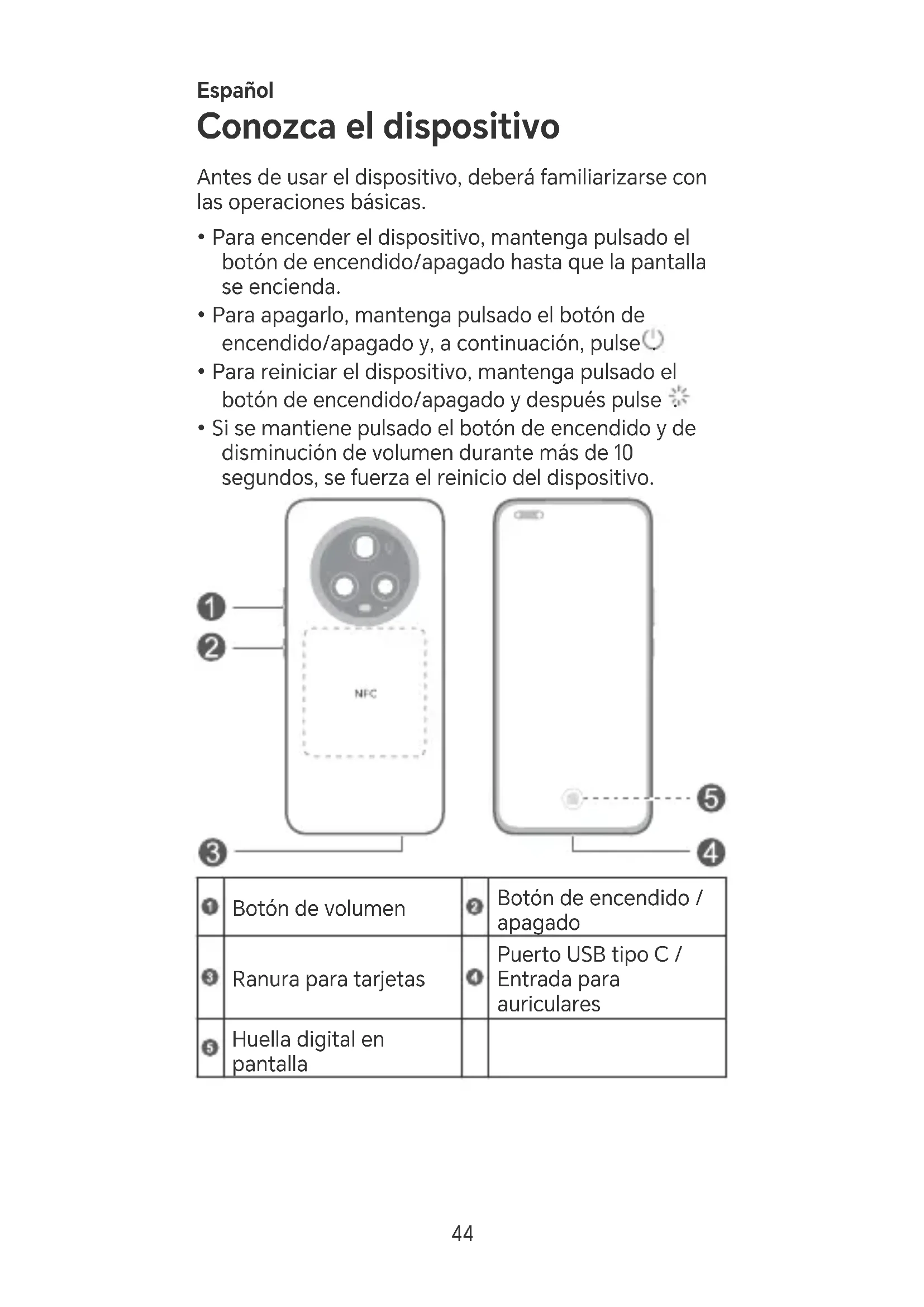 - Si se mantiene pulsado el botón de encendido y de disminución de volumen durante más de 10 segundos, se fuerza el reinicio del dispositivo. Botón de volumen Botón de encendido / apagado Ranura para tarjetas Pueo USB tipo C / Entrada para auriculares Huella digital en pantalla 44• Mantenga el área NFC cerca de los otros dispositivos u objetos cuando utilice la función NFC.
