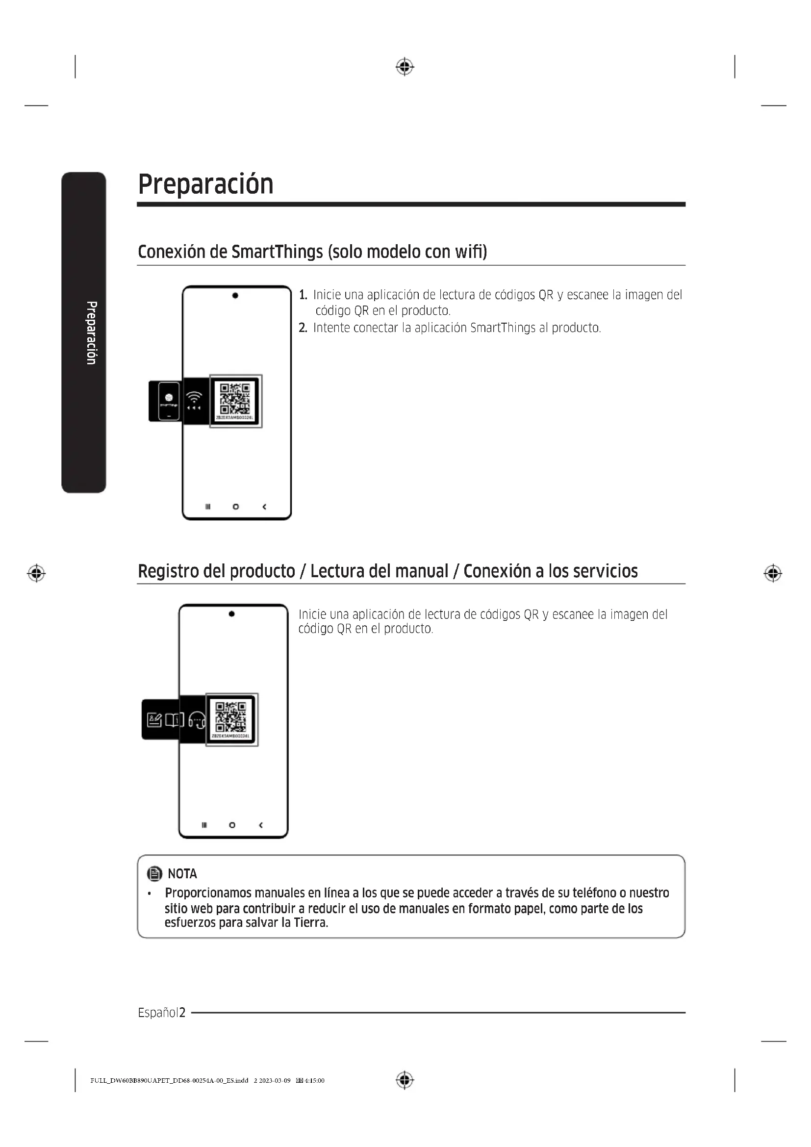 Registro del producto / Lectura del manual / Conexión a los servicios Inicie una aplicación de lectura de códigos QR y escanee la imagen del código QR en el producto. NOTA