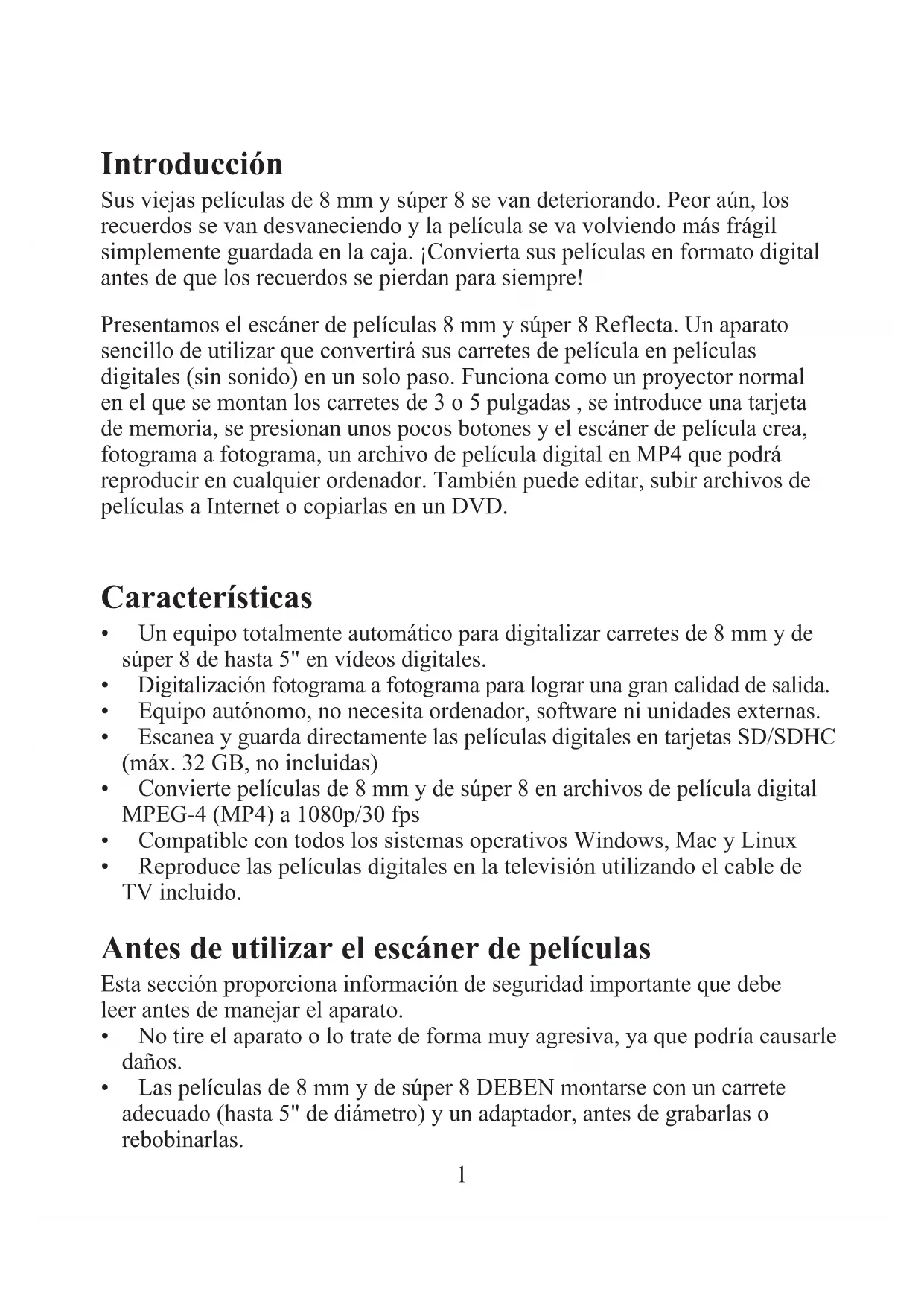 - Especificaciones Introducción Sus viejas películas de 8 mm y súper 8 se van deteriorando. Peor aún, los recuerdos se van desvaneciendo y la película se va volviendo más frágil simplemente guardada en la caja. ¡Convierta sus películas en formato digital antes de que los recuerdos se pierdan para siempre! Presentamos el escáner de películas 8 mm y súper 8 Reflecta. Un aparato sencillo de utilizar que convertirá sus carretes de película en películas digitales (sin sonido) en un solo paso. Funciona como un proyector normal en el que se montan los carretes de 3 o 5 pulgadas , se introduce una tarjeta de memoria, se presionan unos pocos botones y el escáner de película crea, fotograma a fotograma, un archivo de película digital en MP4 que podrá reproducir en cualquier ordenador. También puede editar, subir archivos de películas a Internet o copiarlas en un DVD. Características p. 91