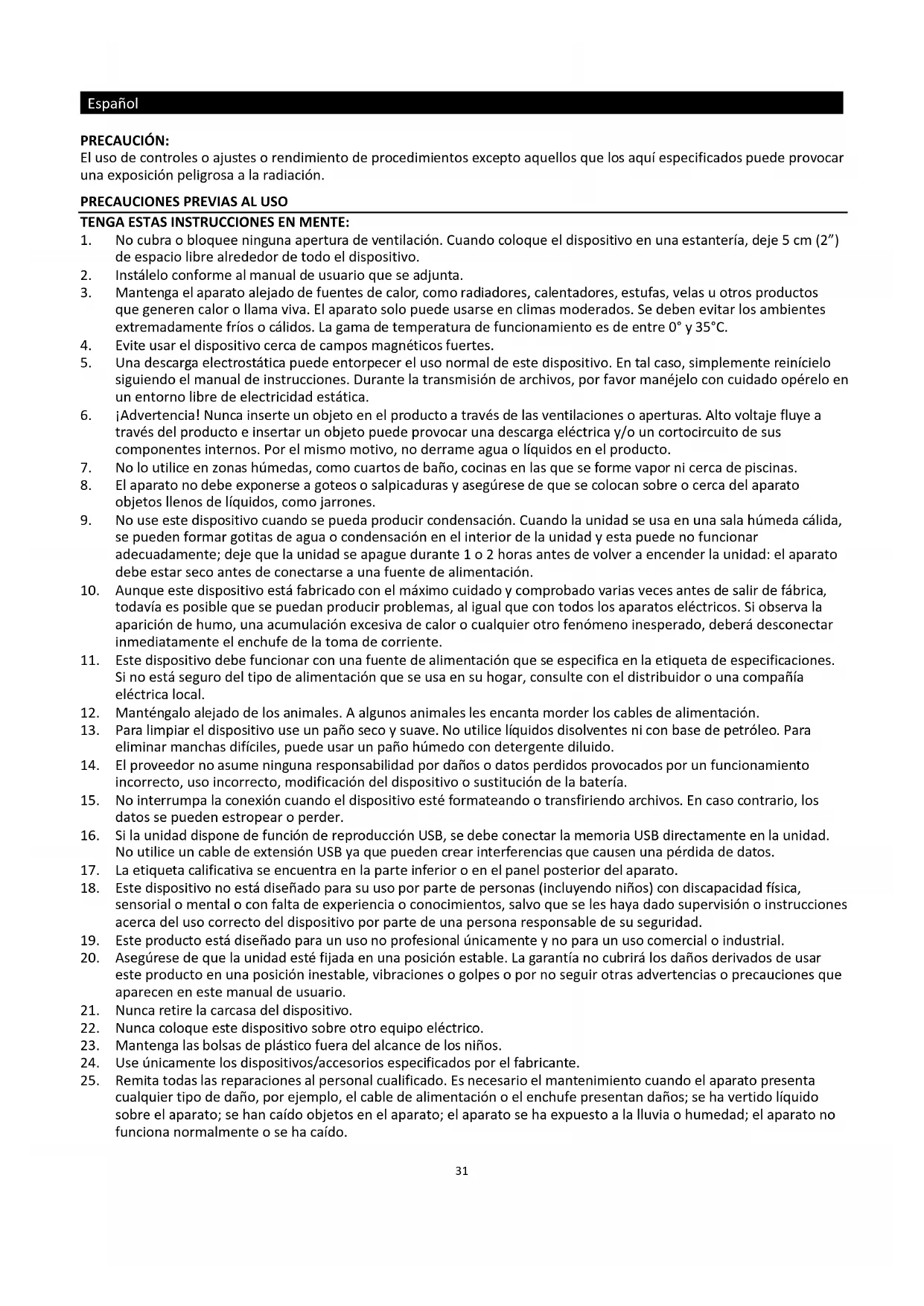 22. Nunca coloque este dispositivo sobre otro equipo eléctrico.