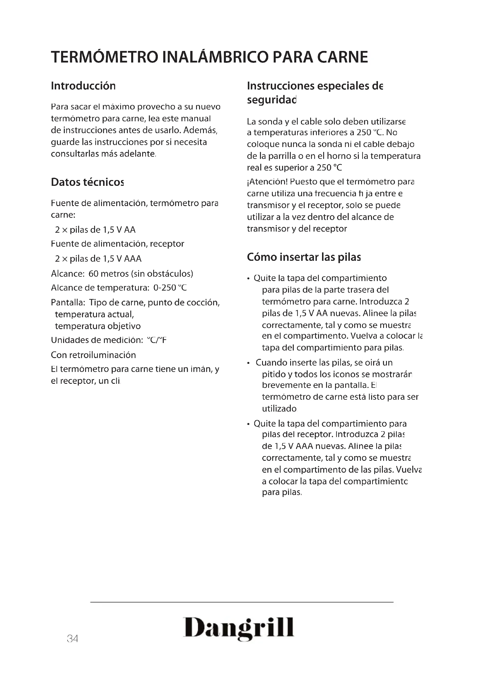 Introducción Para sacar el máximo provecho a su nuevo termómetro para carne, lea este manual de instrucciones antes de usarlo. Además, guarde las instrucciones por si necesita consultarlas más adelante. Datos técnicos Fuente de alimentación, termómetro para carne: 2 × pilas de 1,5 V AA Fuente de alimentación, receptor: 2 × pilas de 1,5 V AAA Alcance: 60 metros (sin obstáculos) Alcance de temperatura: 0-250 °C Pantalla: Tipo de carne, punto de cocción, temperatura actual, temperatura objetivo Unidades de medición: °C/°F Con retroiluminación El termómetro para carne tiene un imán, y el receptor, un cli. Instrucciones especiales de seguridad La sonda y el cable solo deben utilizarse a temperaturas inferiores a 250 °C. No coloque nunca la sonda ni el cable debajo de la parrilla o en el horno si la temperatura real es superior a 250 °C. ¡Atención! Puesto que el termómetro para carne utiliza una frecuencia ja entre el transmisor y el receptor, solo se puede utilizar a la vez dentro del alcance del transmisor y del receptor. Cómo insertar las pilas