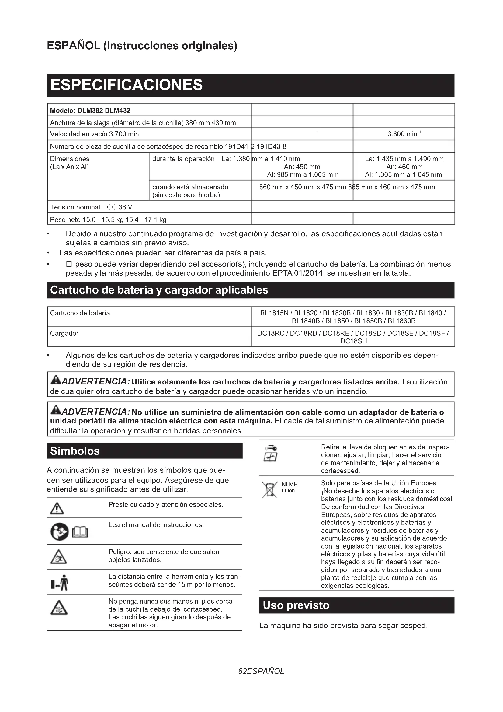 - Algunosdeloscartuchosdebateríaycargadoresindicadosarribapuedequenoesténdisponiblesdepen- diendodesuregiónderesidencia. ADVERTENCIA: Utilice solamente los cartuchos de batería y cargadores listados arriba.Lautilización decualquierotrocartuchodebateríaycargadorpuedeocasionarheridasy/ounincendio. ADVERTENCIA: No utilice un suministro de alimentación con cable como un adaptador de batería o unidad portátil de alimentación eléctrica con esta máquina.Elcabledetalsuministrodealimentaciónpuede dicultarlaoperaciónyresultarenheridaspersonales. Símbolos Acontinuaciónsemuestranlossímbolosquepue- den ser utilizados para el equipo. Asegúrese de que entiendesusignicadoantesdeutilizar. Prestecuidadoyatenciónespeciales. Lea el manual de instrucciones. Peligro; sea consciente de que salen objetoslanzados. Ladistanciaentrelaherramientaylostran- seúntes deberá ser de 15 m por lo menos. No ponga nunca sus manos ni pies cerca delacuchilladebajodelcortacésped. Las cuchillas siguen girando después de apagar el motor. Retire la llave de bloqueo antes de inspec- cionar,ajustar,limpiar,hacerelservicio demantenimiento,dejaryalmacenarel cortacésped. Ni-MH Li-ion SóloparapaísesdelaUniónEuropea ¡No deseche los aparatos eléctricos o bateríasjuntoconlosresiduosdomésticos! De conformidad con las Directivas Europeas, sobre residuos de aparatos eléctricosyelectrónicosybateríasy acumuladoresyresiduosdebateríasy acumuladoresysuaplicacióndeacuerdo conlalegislaciónnacional,losaparatos eléctricosypilasybateríascuyavidaútil hayallegadoasundeberánserreco- gidosporseparadoytrasladadosauna plantadereciclajequecumplaconlas exigenciasecológicas. Uso previsto La máquina ha sido prevista para segar césped.63 ESPAÑOL Ruido El nivel de ruido A-ponderado típico determinado de acuerdo con la norma EN60335-2-77: Modelo DLM382 Niveldepresiónsonora(L