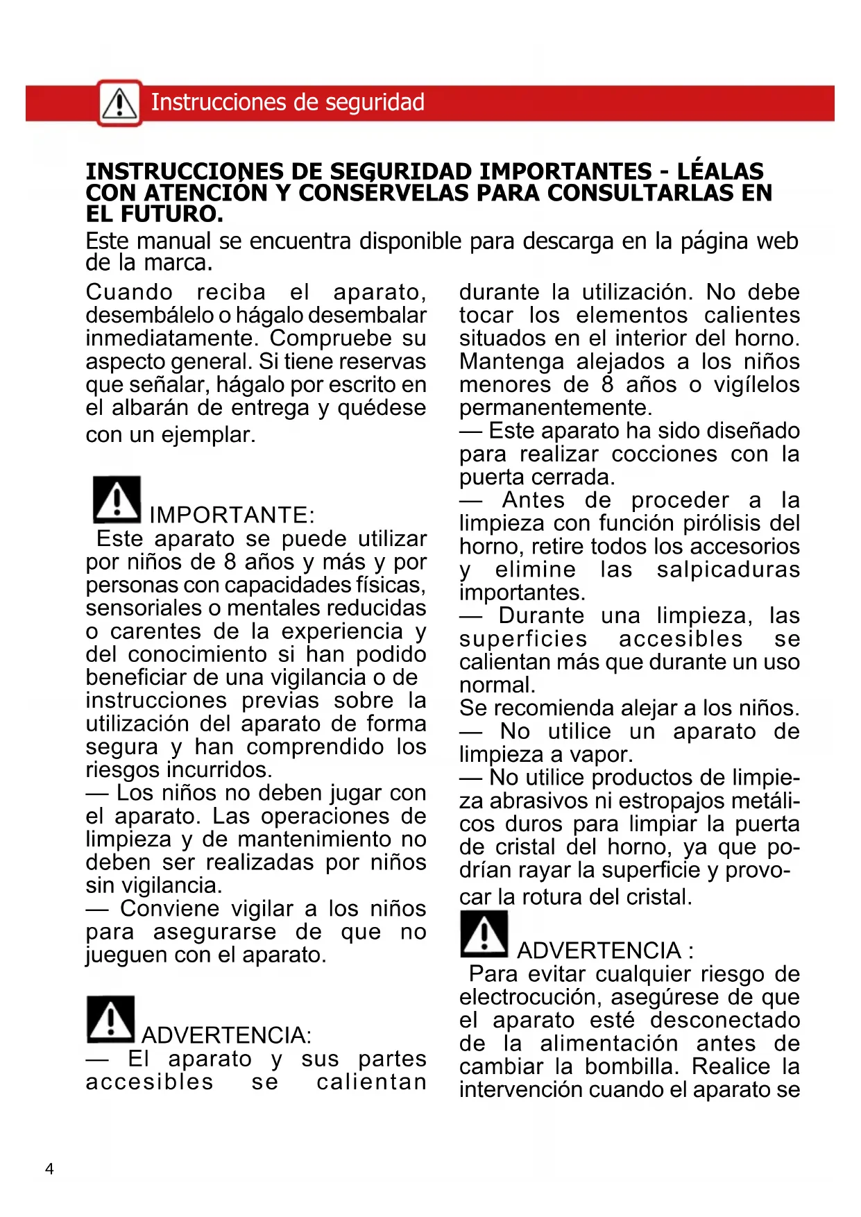 IMPORTANTE: Este aparato se puede utilizar por niños de 8 años y más y por personas con capacidades físicas, sensoriales o mentales reducidas o carentes de la experiencia y del conocimiento si han podido beneciar de una vigilancia o de instrucciones previas sobre la utilización del aparato de forma segura y han comprendido los riesgos incurridos. — Los niños no deben jugar con el aparato. Las operaciones de limpieza y de mantenimiento no deben ser realizadas por niños sin vigilancia. — Conviene vigilar a los niños para asegurarse de que no jueguen con el aparato. ADVERTENCIA: — El aparato y sus partes accesibles se calientan durante la utilización. No debe tocar los elementos calientes situados en el interior del horno. Mantenga alejados a los niños menores de 8 años o vigílelos permanentemente. — Este aparato ha sido diseñado para realizar cocciones con la puerta cerrada. — Antes de proceder a la limpieza con función pirólisis del horno, retire todos los accesorios y elimine las salpicaduras importantes. — Durante una limpieza, las superficies accesibles se calientan más que durante un uso normal. Se recomienda alejar a los niños. — No utilice un aparato de limpieza a vapor. — No utilice productos de limpie- za abrasivos ni estropajos metáli- cos duros para limpiar la puerta de cristal del horno, ya que po- drían rayar la supercie y provo- car la rotura del cristal. ADVERTENCIA : Para evitar cualquier riesgo de electrocución, asegúrese de que el aparato esté desconectado de la alimentación antes de cambiar la bombilla. Realice la intervención cuando el aparato se INSTRUCCIONES DE SEGURIDAD IMPORTANTES - LÉALAS CON ATENCIÓN Y CONSÉRVELAS PARA CONSULTARLAS EN EL FUTURO. Este manual se encuentra disponible para descarga en la página web de la marca.5 Instrucciones de seguridad Instrucciones de seguridad haya enfriado. Para desatornillar la tulipa y la bombilla, utilice un guante de goma que facilitará el desmontaje. El enchufe debe estar accesible después de realizar la instalación. El aparato se debe poder desconectar de la red eléctrica, bien por medio de un enchufe o bien incorporando un interruptor en las canalizaciones fijas siguiendo las normas de instalación. Si el cable de alimentación está dañado, debe ser reemplazado por el fabricante, su servicio de postventa o una persona de calicación similar para evitar un peligro. — Este aparato puede instalarse indiferentemente bajo un plano o en una columna tal como se indica en el esquema de instalación. — Centre el horno en el mueble respetando una distancia mínima de 5 mm con el mueble contiguo. El material del mueble de empotramiento debe ser resistente al calor (o estar recubierto con un material resistente). Para más estabilidad, je el horno en el mueble con 2 tornillos, a través de los oricios previstos para dicho n en los montantes laterales. — El aparato no debe instalarse detrás de una puerta decorativa, con el n de evitar un recalentamiento. — Este aparato está destinado para ser utilizado en aplicaciones domésticas y análogas como: Pequeñas cocinas reservadas al personal de tiendas, ocinas y entornos profesionales. Granjas. La utilización por clientes de hoteles, moteles y otros entornos de carácter residencial, entornos de tipo habitaciones de huéspedes. — Para cualquier intervención de limpieza en la cavidad del horno, éste debe estar apagado. No modique las características de este aparato; hacerlo representaría un peligro para usted. No utilice el horno como despensa o para guardar accesorios después de su utilización.6 Instalación del aparato Instalación del aparato
