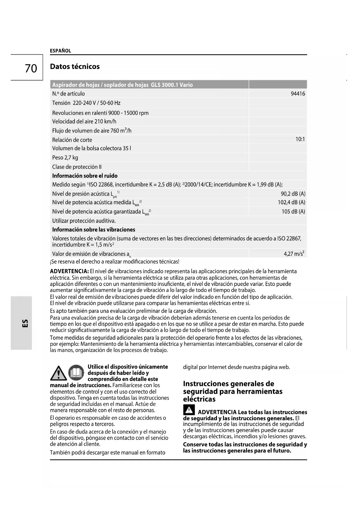 POLSKI PL70 Datos técnicos Aspirador de hojas / soplador de hojas GLS 3000.1 Vario N.º de artículo