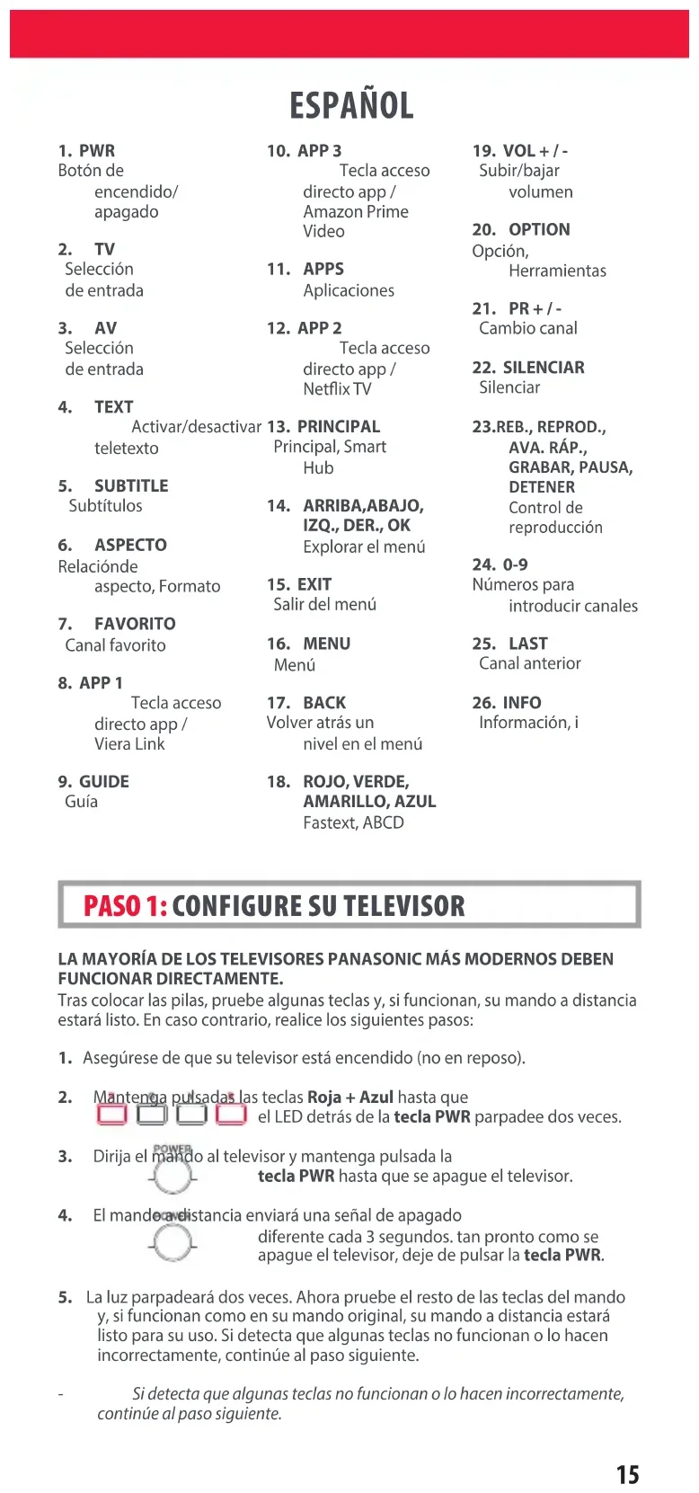 Información, i 712188_Panasonic_manual URC4914_RDN1091120.indd 15712188_Panasonic_manual URC4914_RDN1091120.indd 15 09-11-2020 13:1509-11-2020 13:1516 ESPAÑOL PROGRAME UNA NUEVA FUNCIÓN EN SU MANDO Su mando a distancia One For All puede aprender cualquier función de su mando a distancia original, siempre que funcione.1. Coloque el mando a distancia original delante del mando One For All sobre una supercie plana.2. Para aprender: Mantenga pulsadas las teclas VERDE + AMARILLA hasta que el LED parpadee dos veces.3. Pulse 975. El LED parpadeará dos veces.4. Pulse la tecla que desee programar en el mando a distancia One For All, por ejemplo: la tecla VOL +. El LED parpadeará rápidamente.5. Pulse la tecla que desee programar en el mando a distancia original, por ejemplo, la tecla VOL + de su dispositivo de AUDIO.6. Dos parpadeos: aceptar. Repita a partir del paso 4 si desea programar más teclas. Parpadeo largo: inténtelo de nuevo desde el paso 4.7. Cuando haya programado todas las teclas que necesite, mantenga pulsada la tecla ACEPTAR durante 3 segundos. El LED parpadeará dos veces.CÓMO ELIMINAR UNA FUNCIÓN PROGRAMADA 1. Mantenga pulsadas las teclas VERDE + AMARILLA hasta que el LED parpadee dos veces.2. Pulse 976.3. Pulse dos veces la tecla que hay que desprogramar.4. El LED parpadeará dos veces y la tecla volverá a su función original. PROGRAMACIÓN ¿HAY ALGUNAS TECLAS QUE NO FUNCIONAN COMO SE ESPERA?Si detecta que algunas teclas no funcionan o lo hacen incorrectamente, continúe al paso siguiente.1. Asegúrese de que su televisor está encendido (no en reposo).2. Mantenga pulsadas las teclas ROJA + AZUL hasta que el LED detrás de la tecla PWR parpadee dos veces.3. Dirija el mando al televisor y mantenga pulsada una de las teclas que no está funcionando correctamente (por ejemplo, Menu [Menú]). 4. El mando a distancia enviará una señal cada 3 segundos.5. Cuando se muestre la función correcta en la pantalla (en este caso Menu [Menú]), suelte la tecla.6. El LED parpadeará dos veces: su mando está listo para su uso. PASO 2: SI EL PASO 1 NO FUNCIONA COMO SE ESPERA