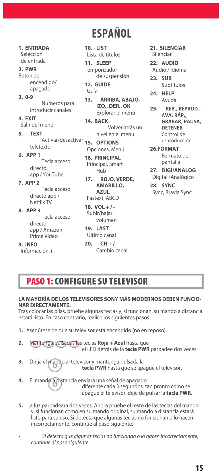 Mantenga pulsadas las teclas ROJA + AZUL hasta que el LED detrás de la tecla PWR parpadee dos veces.