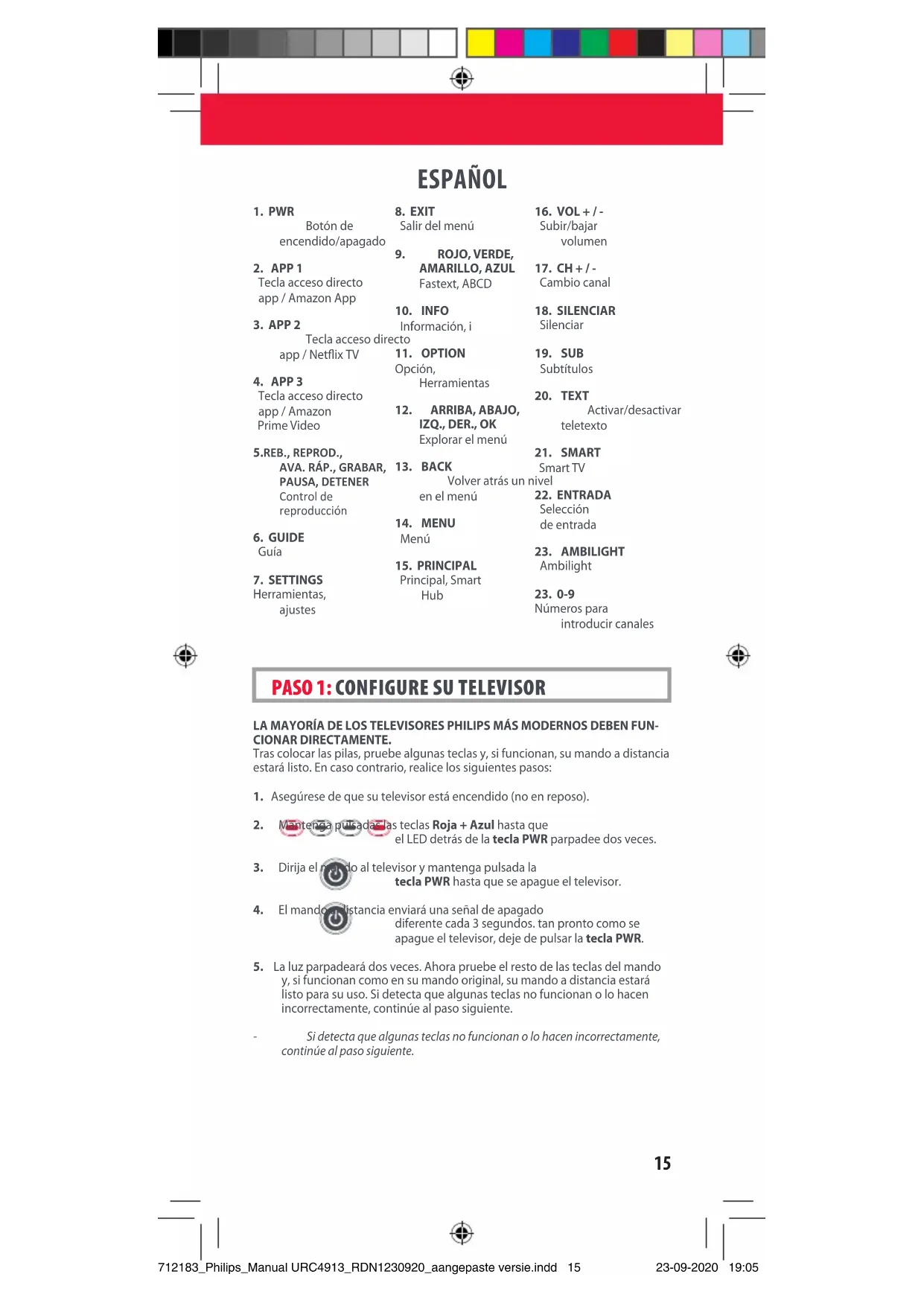 Números para introducir canales 712183_Philips_Manual URC4913_RDN1230920_aangepaste versie.indd 15712183_Philips_Manual URC4913_RDN1230920_aangepaste versie.indd 15 23-09-2020 19:0523-09-2020 19:0516 ESPAÑOL PROGRAME UNA NUEVA FUNCIÓN EN SU MANDO Su mando a distancia One For All puede aprender cualquier función de su mando a distancia original, siempre que funcione.