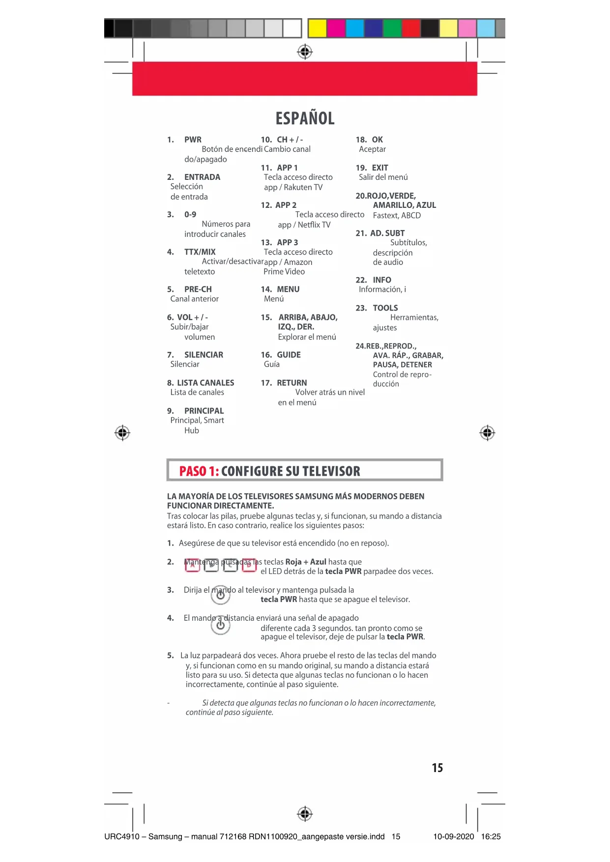 ¿HAY ALGUNAS TECLAS QUE NO FUNCIONAN COMO SE ESPERA?Si detecta que algunas teclas no funcionan o lo hacen incorrectamente, continúe al paso siguiente.1. Asegúrese de que su televisor está encendido (no en reposo).2. Mantenga pulsadas las teclas ROJA + AZUL hasta que el LED detrás de la tecla PWR parpadee dos veces.3. Dirija el mando al televisor y mantenga pulsada una de las teclas que no está funcionando correctamente (por ejemplo, Menu [Menú]). 4. El mando a distancia enviará una señal cada 3 segundos.5. Cuando se muestre la función correcta en la pantalla (en este caso Menu [Menú]), suelte la tecla.6. El LED parpadeará dos veces: su mando está listo para su uso. PASO 2: SI EL PASO 1 NO FUNCIONA COMO SE ESPERA URC4910 – Samsung – manual 712168 RDN1100920_aangepaste versie.indd 16URC4910 – Samsung – manual 712168 RDN1100920_aangepaste versie.indd 16 10-09-2020 16:2510-09-2020 16:2517 ESPAÑOL CONTROL DEL VOLUMEN DE BARRA DE SONIDO / RECEPTOR DE AUDIO Si tiene su televisor conectado a una barra de sonido o receptor de audio, es posible congurar su mando a distancia One For All para controlar el Volumen y la función Silenciar de este dispositivo. hay dos formas de hacer esto:SIMPLESET DE AUDIOSi tiene una barra de sonido o un dispositivo de audio de una de las marcas enumeradas en la tabla a continuación, puede usar el método SimpleSet para programar su mando a distancia para controlarlo. Si no tiene una de las siguien tes marcas, pase a la siguiente sección.Tenga en cuenta que cada una de las marcas tiene un dígito asociado, por ejemplo, 4 para LG (y JVC).Para congurar su mando para controlar su barra de sonido/dispositivo de audio, primero asegúrese de que su televisor y la barra de sonido/dispositivo de audio estén encendidos, y que haya algo reproduciéndose que pueda escuchar (este procedimiento probará la función Silenciar). Siguiente: