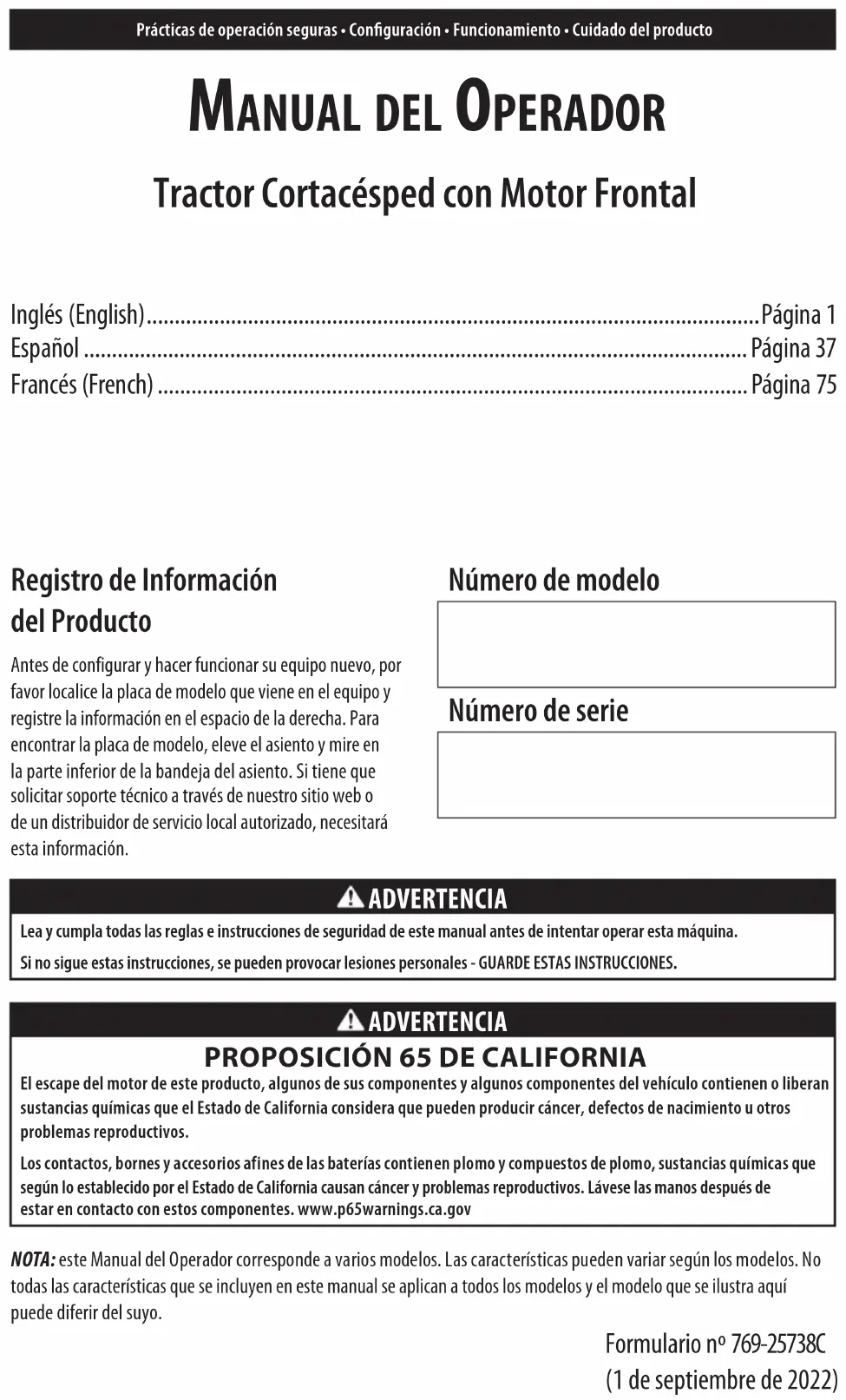 3. Check tire pressure in all four tires.Prácticas de operación seguras • Conguración • Funcionamiento • Cuidado del producto Tractor Cortacésped con Motor Frontal NOTA: este Manual del Operador corresponde a varios modelos. Las características pueden variar según los modelos. No todas las características que se incluyen en este manual se aplican a todos los modelos y el modelo que se ilustra aquí puede diferir del suyo. Registro de Información del Producto Antes de configurar y hacer funcionar su equipo nuevo, por favor localice la placa de modelo que viene en el equipo y registre la información en el espacio de la derecha. Para encontrar la placa de modelo, eleve el asiento y mire en la parte inferior de la bandeja del asiento. Si tiene que solicitar soporte técnico a través de nuestro sitio web o de un distribuidor de servicio local autorizado, necesitará esta información. Número de modelo Número de serie Inglés (English) .............................................................................................................Página 1 Español ......................................................................................................................Página 37 Francés (French) ......................................................................................................... Página 75 Manual del OperadOr ADVERTENCIA Lea y cumpla todas las reglas e instrucciones de seguridad de este manual antes de intentar operar esta máquina. Si no sigue estas instrucciones, se pueden provocar lesiones personales - GUARDE ESTAS INSTRUCCIONES. ADVERTENCIA