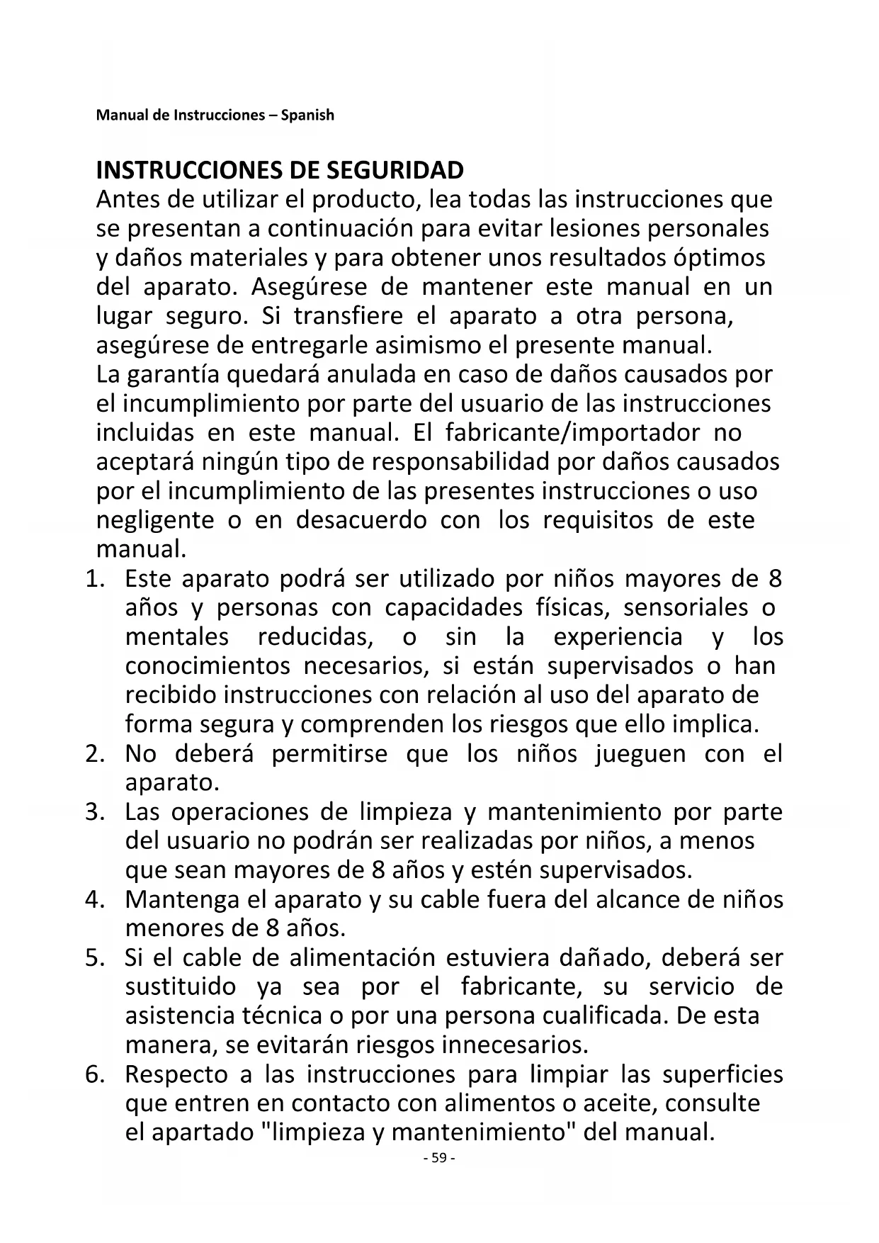 Antes de utilizar el producto, lea todas las instrucciones que se presentan a continuación para evitar lesiones personales y daños materiales y para obtener unos resultados óptimos del aparato. Asegúrese de mantener este manual en un lugar seguro. Si transfiere el aparato a otra persona, asegúrese de entregarle asimismo el presente manual. La garantía quedará anulada en caso de daños causados por el incumplimiento por parte del usuario de las instrucciones incluidas en este manual. El fabricante/importador no aceptará ningún tipo de responsabilidad por daños causados por el incumplimiento de las presentes instrucciones o uso negligente o en desacuerdo con los requisitos de este manual.