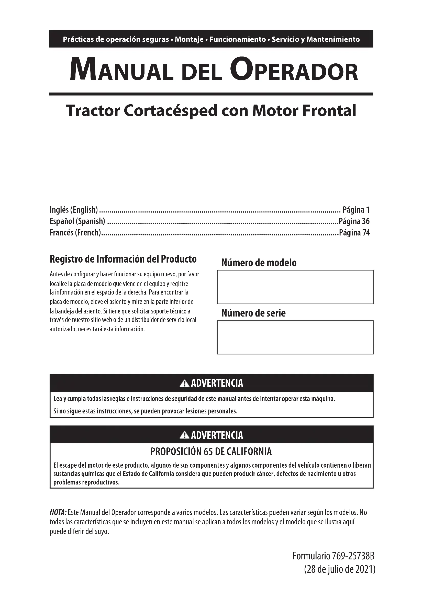 3. Check tire pressure in all four tires.Prácticas de operación seguras • Montaje • Funcionamiento • Servicio y Mantenimiento Tractor Cortacésped con Motor Frontal NOTA: Este Manual del Operador corresponde a varios modelos. Las características pueden variar según los modelos. No todas las características que se incluyen en este manual se aplican a todos los modelos y el modelo que se ilustra aquí puede diferir del suyo. ADVERTENCIA Lea y cumpla todas las reglas e instrucciones de seguridad de este manual antes de intentar operar esta máquina. Si no sigue estas instrucciones, se pueden provocar lesiones personales. ADVERTENCIA