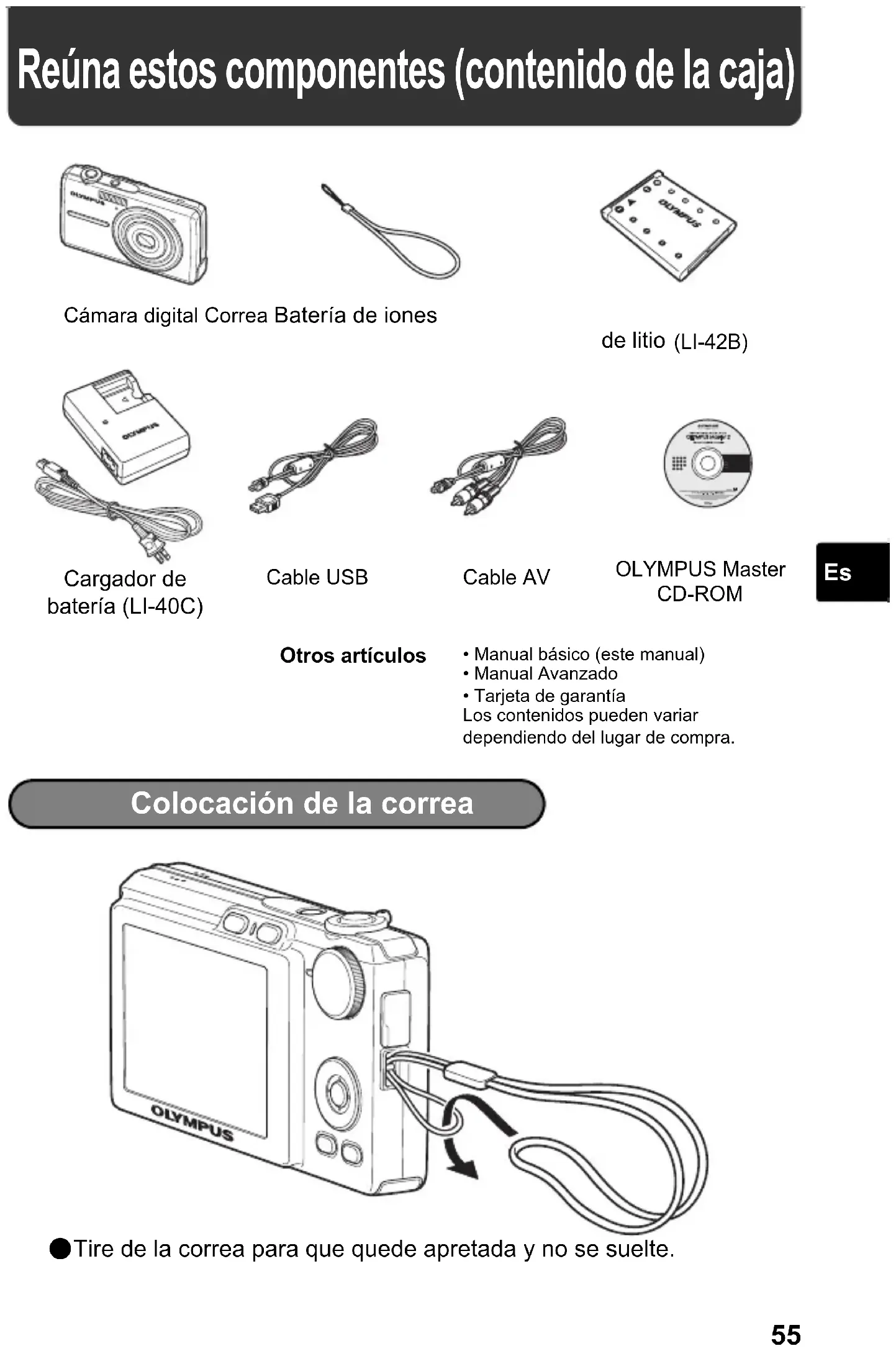 Reúna estos componentes (contenido de la caja) Colocación de la correa ( Tire de la correa para que quede apretada y no se suelte. Otros artículos• Manual básico (este manual)• Manual Avanzado• Tarjeta de garantíaLos contenidos pueden variar dependiendo del lugar de compra.Cámara digital Correa Batería de iones de litio (LI-42B) Cargador de batería (LI-40C) Cable USBOLYMPUS Master CD-ROMCable AV d4337_oai_s_basic_00_bookfile.book Page 55 Wednesday, November 29, 2006 9:53 AM56