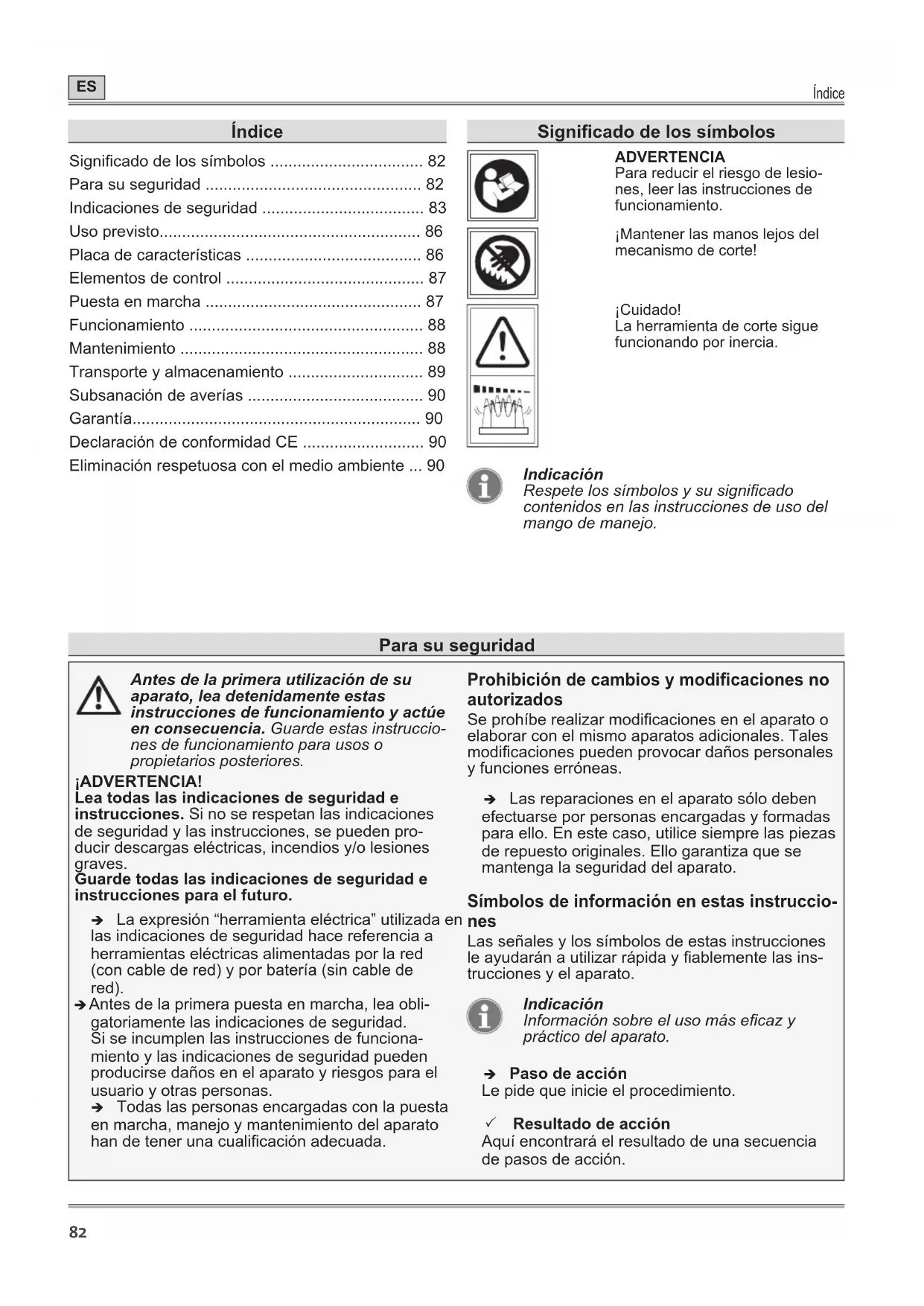 - Eliminación respetuosa con el medio ambiente Signicado de los símbolos ADVERTENCIA Para reducir el riesgo de lesio- nes, leer las instrucciones de funcionamiento. ¡Mantener las manos lejos del mecanismo de corte! ¡Cuidado! La herramienta de corte sigue funcionando por inercia. Indicación Respete los símbolos y su signicado contenidos en las instrucciones de uso del mango de manejo. Para su seguridad Antes de la primera utilización de su aparato, lea detenidamente estas instrucciones de funcionamiento y actúe en consecuencia. Guarde estas instruccio- nes de funcionamiento para usos o propietarios posteriores. ¡ADVERTENCIA! Lea todas las indicaciones de seguridad e instrucciones. Si no se respetan las indicaciones de seguridad y las instrucciones, se pueden pro- ducir descargas eléctricas, incendios y/o lesiones graves. Guarde todas las indicaciones de seguridad e instrucciones para el futuro. Î La expresión “herramienta eléctrica” utilizada en las indicaciones de seguridad hace referencia a herramientas eléctricas alimentadas por la red (con cable de red) y por batería (sin cable de red). Î Antes de la primera puesta en marcha, lea obli- gatoriamente las indicaciones de seguridad. Si se incumplen las instrucciones de funciona- miento y las indicaciones de seguridad pueden producirse daños en el aparato y riesgos para el usuario y otras personas. Î Todas las personas encargadas con la puesta en marcha, manejo y mantenimiento del aparato han de tener una cualicación adecuada. Prohibición de cambios y modificaciones no autorizados Se prohíbe realizar modicaciones en el aparato o elaborar con el mismo aparatos adicionales. Tales modicaciones pueden provocar daños personales y funciones erróneas. Î Las reparaciones en el aparato sólo deben efectuarse por personas encargadas y formadas para ello. En este caso, utilice siempre las piezas de repuesto originales. Ello garantiza que se mantenga la seguridad del aparato. Símbolos de información en estas instruccio- nes Las señales y los símbolos de estas instrucciones le ayudarán a utilizar rápida y ablemente las ins- trucciones y el aparato. Indicación Información sobre el uso más ecaz y práctico del aparato. Î Paso de acción Le pide que inicie el procedimiento. 3 Resultado de acción Aquí encontrará el resultado de una secuencia de pasos de acción.Para su seguridad p. 90