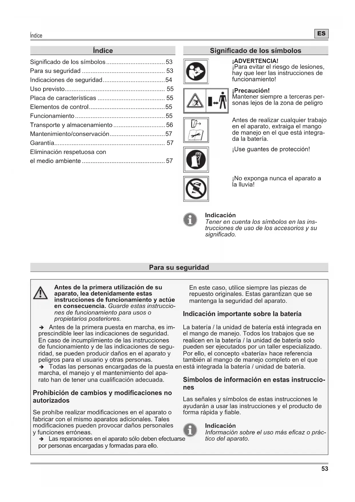 - Antes de la primera utilización de su aparato, lea detenidamente estas instrucciones de funcionamiento y actúe en consecuencia. Guarde estas instruccio- nes de funcionamiento para usos o propietarios posteriores. Î Antes de la primera puesta en marcha, es im- prescindible leer las indicaciones de seguridad. En caso de incumplimiento de las instrucciones de funcionamiento y de las indicaciones de segu- ridad, se pueden producir daños en el aparato y peligros para el usuario y otras personas. Î Todas las personas encargadas de la puesta en marcha, el manejo y el mantenimiento del apa- rato han de tener una cualicación adecuada. Prohibición de cambios y modificaciones no autorizados Se prohíbe realizar modicaciones en el aparato o fabricar con el mismo aparatos adicionales. Tales modicaciones pueden provocar daños personales y funciones erróneas. Î Las reparaciones en el aparato sólo deben efectuarse por personas encargadas y formadas para ello. En este caso, utilice siempre las piezas de repuesto originales. Estas garantizan que se mantenga la seguridad del aparato. Indicación importante sobre la batería La batería / la unidad de batería está integrada en el mango de manejo. Todos los trabajos que se realicen en la batería / la unidad de batería solo pueden ser ejecutados por un taller especializado. Por ello, el concepto «batería» hace referencia también al mango de manejo completo en el que está integrada la batería / unidad de batería. Símbolos de información en estas instruccio- nes Las señales y símbolos de estas instrucciones le ayudarán a usar las instrucciones y el producto de forma rápida y able. Indicación Información sobre el uso más ecaz o prác- tico del aparato. Índice Signicado de los símbolos p. 53