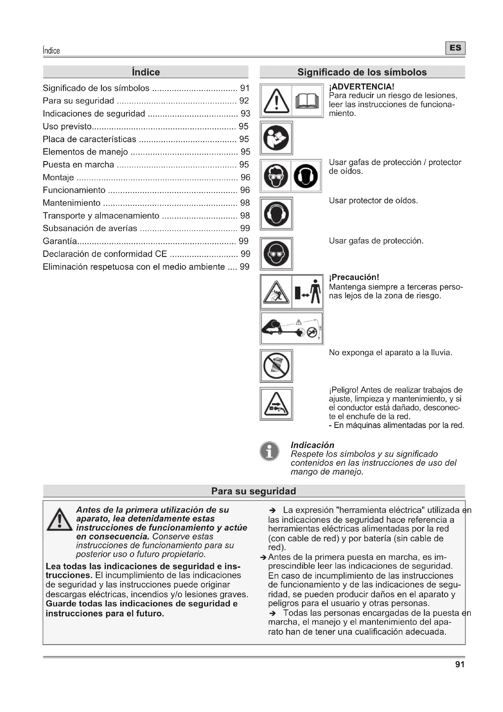 - Eliminación respetuosa con el medio ambiente Signicado de los símbolos ¡ADVERTENCIA! Para reducir un riesgo de lesiones, leer las instrucciones de funciona- miento. Usar gafas de protección / protector de oídos. Usar protector de oídos. Usar gafas de protección. ¡Precaución! Mantenga siempre a terceras perso- nas lejos de la zona de riesgo. No exponga el aparato a la lluvia. ¡Peligro! Antes de realizar trabajos de ajuste, limpieza y mantenimiento, y si el conductor está dañado, desconec- te el enchufe de la red. - En máquinas alimentadas por la red. Indicación Respete los símbolos y su signicado contenidos en las instrucciones de uso del mango de manejo. Para su seguridad Antes de la primera utilización de su aparato, lea detenidamente estas instrucciones de funcionamiento y actúe en consecuencia. Conserve estas instrucciones de funcionamiento para su posterior uso o futuro propietario. Lea todas las indicaciones de seguridad e ins- trucciones. El incumplimiento de las indicaciones de seguridad y las instrucciones puede originar descargas eléctricas, incendios y/o lesiones graves. Guarde todas las indicaciones de seguridad e instrucciones para el futuro. Î La expresión "herramienta eléctrica" utilizada en las indicaciones de seguridad hace referencia a herramientas eléctricas alimentadas por la red (con cable de red) y por batería (sin cable de red). Î Antes de la primera puesta en marcha, es im- prescindible leer las indicaciones de seguridad. En caso de incumplimiento de las instrucciones de funcionamiento y de las indicaciones de segu- ridad, se pueden producir daños en el aparato y peligros para el usuario y otras personas. Î Todas las personas encargadas de la puesta en marcha, el manejo y el mantenimiento del apa- rato han de tener una cualicación adecuada.Para su seguridad p. 99