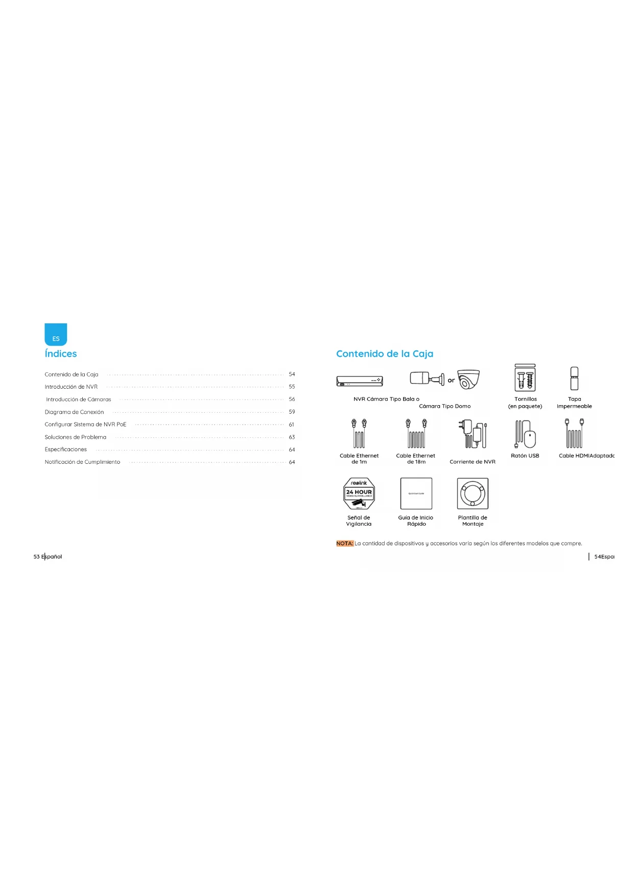 54Español 53 Español Contenido de la Caja NOTA: La cantidad de dispositivos y accesorios varía según los diferentes modelos que compre. Cable HDMIAdaptador de Corriente de NVR Ratón USB NVR Cámara Tipo Bala o Cámara Tipo Domo Señal de Vigilancia Tapa Impermeable Tornillos (en paquete) Cable Ethernet de 18m Guía de Inicio Rápido Plantilla de Montaje Cable Ethernet de 1m orPWR HDD ALL MENU SELECT AUDIO OUT