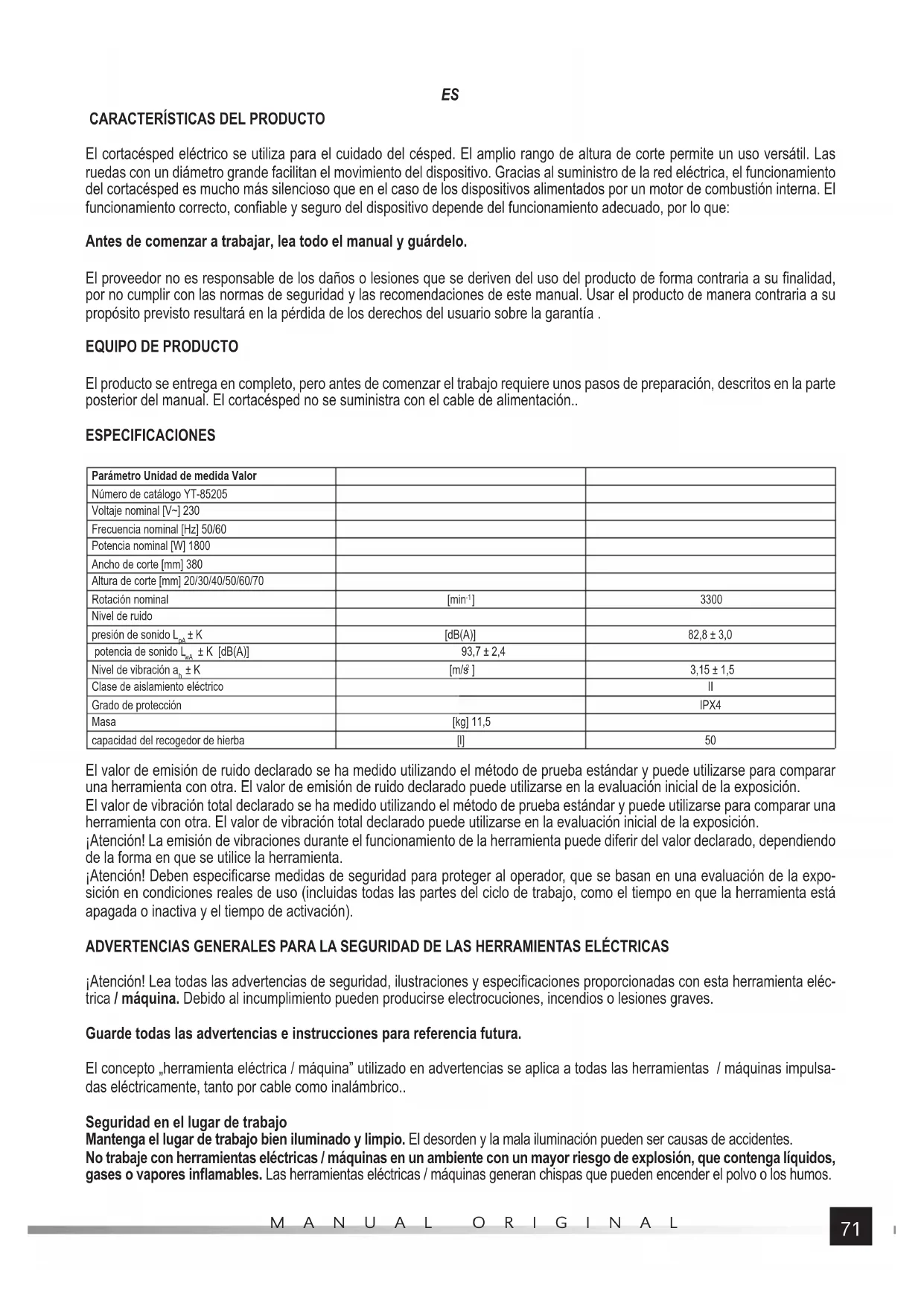 El producto se entrega en completo, pero antes de comenzar el trabajo requiere unos pasos de preparación, descritos en la parte posterior del manual. El cortacésped no se suministra con el cable de alimentación.. ESPECIFICACIONES Parámetro Unidad de medida Valor Número de catálogo YT-85205 Voltaje nominal [V~] 230 Frecuencia nominal [Hz] 50/60 Potencia nominal [W] 1800 Ancho de corte [mm] 380 Altura de corte [mm] 20/30/40/50/60/70 Rotación nominal [min