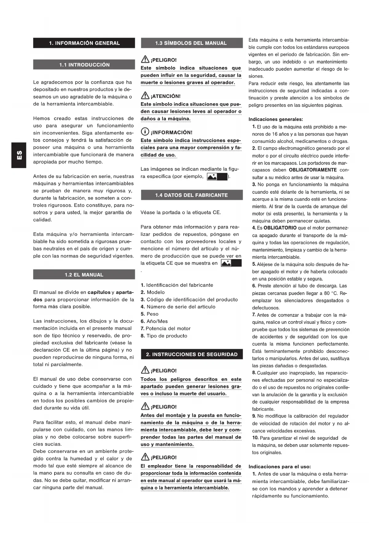 ¡PELIGRO! Todos los peligros descritos en este apartado pueden generar lesiones gra- ves o incluso la muerte del usuario. ¡PELIGRO! Antes del montaje y la puesta en funcio- namiento de la máquina o de la herra- mienta intercambiable, debe leer y com- prender todas las partes del manual de uso y mantenimiento. ¡PELIGRO! El empleador tiene la responsabilidad de proporcionar toda la información contenida en este manual al operador que usará la má- quina o la herramienta intercambiable. ¡PELIGRO! ¡ATENCIÓN! ¡INFORMACIÓN! Esta máquina o esta herramienta intercambia- ble cumple con todos los estándares europeos vigentes en el periodo de fabricación. Sin em- bargo, un uso indebido o un mantenimiento inadecuado pueden aumentar el riesgo de le- siones. Para reducir este riesgo, lea atentamente las instrucciones de seguridad indicadas a con- tinuación y preste atención a los símbolos de peligro presentes en las siguientes páginas. Indicaciones generales: