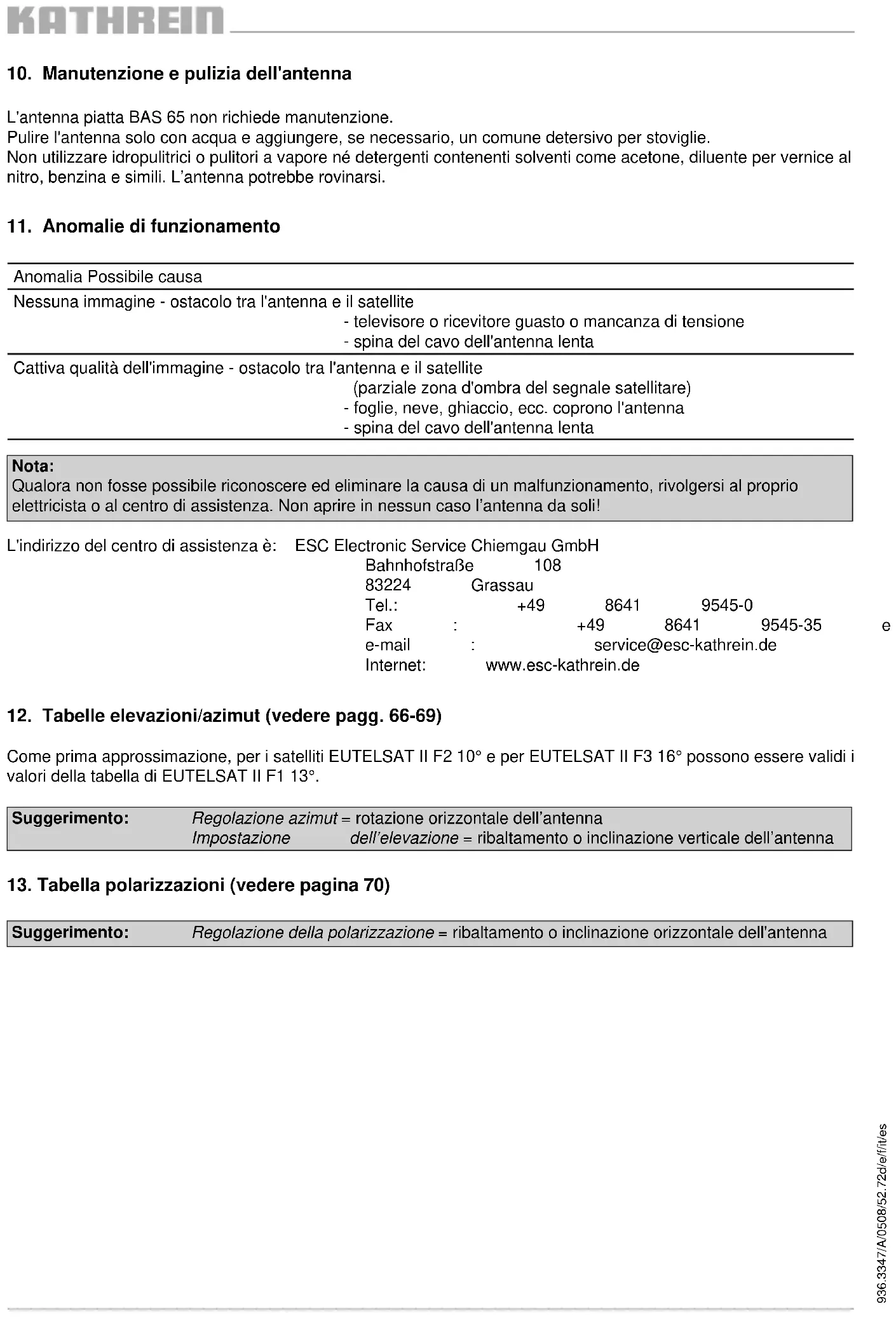 Una vez orientada y fi jada la antena, controle de nuevo el fi rme asiento de todas las uniones por tornillos. Fije el cable de antena al soporte de la antena (p. ej. con cintas sujetacables), para que éste no roce ni se dañe.936.3347/A/0508/65.72d/e/f/it/es La dirección de nuestra delegación del servicio técnico: ESC Electronic Service Chiemgau GmbH Bahnhofstraße 108 83224 Grassau Teléfono: +49 8641 9545-0 Fax: +49 8641 9545-35 y -36 E-mail: service@esc-kathrein.de Internet. www.esc-kathrein.de Nota: Si no pudiera detectar y eliminar la causa de la avería, póngase en contacto con un profesional especializado o con nuestra delegación del servicio técnico. ¡No abra en ningún caso la antena!
