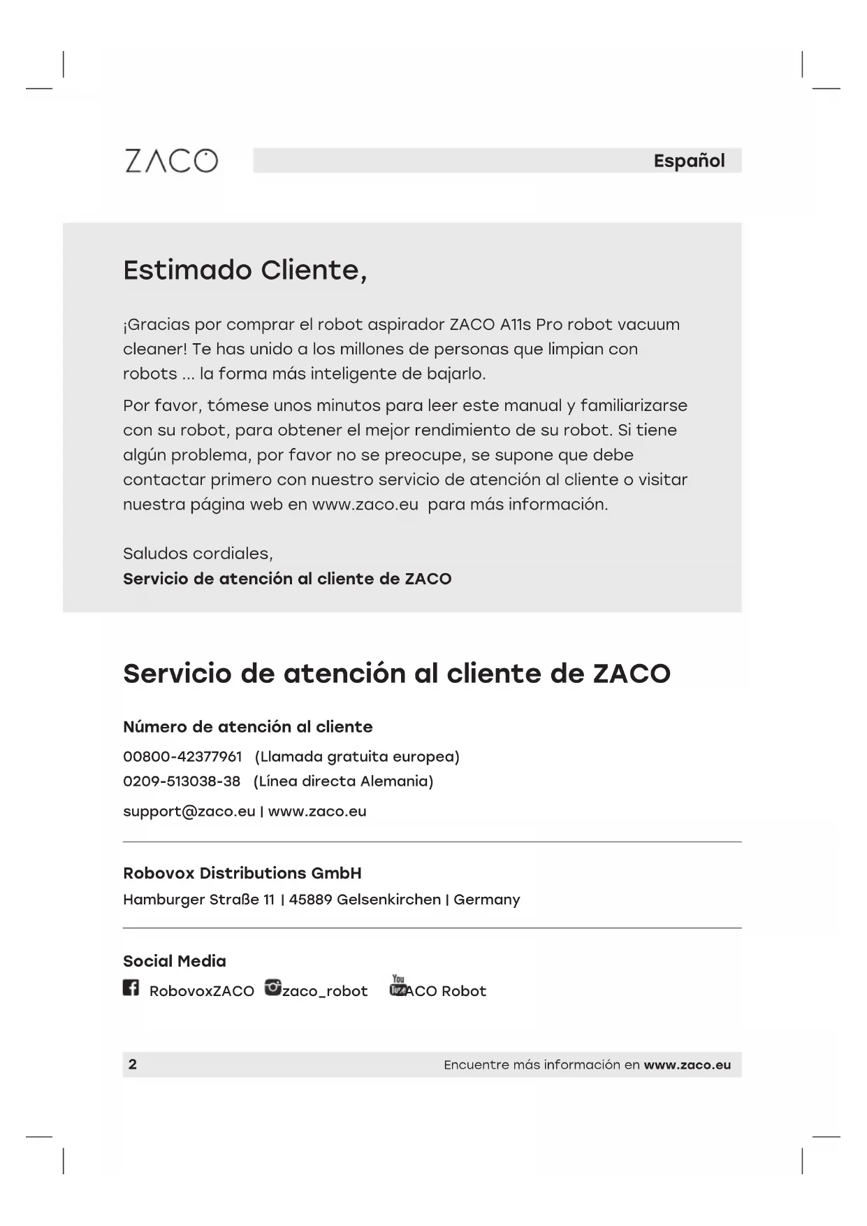 modo DND o no será compatible con la limpieza programada. El robot está siempre off-line Asegúrese de que el robot estáconectado correctamente a internet y se encuentra dentro de la cobertura Wi-Fi. No se puede establecer conexión con la app Asegúrese de que la estación de carga y el robot están dentro del rango de cobertura Wi-Fi y que la señal es buena. Reinicie la Wi-Fi según las instrucciones del manual e inténtelo de nuevo. Confirme que el sensor láser no está bloqueado y ponga en marcha el robot. El sensor láser está bloqueado o atascado por piezas exteriores. Elimine con cuidado la obstrucción o las piezas exteriores. Si no es posible, desplace el robot a un lugar nuevo y empiece de nuevo. Limpie el sensor de detección de abismo, desplace el robot a un lugar nuevo y empiece de nuevo. El robot está suspendido en el aire. Muévalo a un lugar nuevo y empiece de nuevo. Si el sensor de detección de abismo está demasiado sucio, esta podría ser tam- bién la causa del fallo. Limpie el sensor de detección de abismo. Compruebe y limpie las piezas exteriores del sensor de choque El sensor de choque está bloqueado. Dé varios golpecitos para retirar las piezas exteriores. Desplace el robot a un lugar nuevo y empiece de nuevo. Ponga en marcha el robot en un suelo horizontal. El robot no se encuentra sobre una superficie plana. Coloque el robot sobre una superficie plana y póngalo en marcha de nuevo; también puede reiniciarlo en la app una vez que esté nivelado.27 Encuentre más información en www.zaco.eu Español Resolución de problemas Confirme que el recogedor de polvo está instalado en la posición correcta. El recogedor de polvo no está instalado en la posición correcta. Vuelva a instalarlo y asegúrese de que está instalado en la posición correcta. Elimine los obstáculos alrededor del robot e inténtelo de nuevo. El robot podría estar atascado o atrapa- do. Elimine los obstáculos a su alrededor. Limpie el sensor IR de contornos. El sensor IR de contornos podría estar sucio. Límpielo. Compruebe que el sensor de identidad visu- al no está bloqueado. El sensor de identidad visual está blo- queado por un objeto. Elimine el bloqueo. Confirme que el depósito de agua está instalado correctamente. Vuelva a instalar el depósito de agua en la posición correcta y ajuste el cierre. Confirme que la mopa está instalada correctamente. Compruebe el soporte de la mopa y la mopa y ajuste el cierre. Vuelva a colocar el robot en la estación de carga. El robot no detecta la estación de carga. Vuelva a colocarlo en estación de carga y revise la ubicación de esta. Batería baja. Cargue el robot. El nivel de batería es demasiado bajo. El robot no puede ponerse en marcha automáticamente. Vuelva a colocarlo en estación de carga.28 Encuentre más información en www.zaco.eu Español Especificaciones del producto Classification Item Detail Especificaciones mecánicas Tamaño 353 x 353 x 96 mm Peso 3,4 kg Especificaciones eléctricas Alimentación 50 W Tipo de batería 5200 mAh Tipo de carga Carga automática Especificaciones de limpieza Modo de limpieza Limpieza puntual, Contornos, MÁX y Programación diaria Tiempo de carga 250-300 Min Tiempo de limpieza ≈ 150 Min Tipo de botón de la unidad principal - Botón mecánico Conexión a - Wi-Fi IEEE 802.11b/g/n2.4GHz A11s Pro29 Encuentre más información en www.zaco.eu Español Banda de frecuencia Declaración de conformidad de la UE Frecuencia TX 2.4 ~ 2.4835 GHz Frecuencia RX 2.4 ~ 2.4835 GHz Ganancia de la antena 2.6 dBi Potencia de salida RF 802.11b 17+-2 dBm 802.11g 17+-1.5 dBm 802.11n 16+-1.5 dBm Banda de frecuencia y potencia de salida Robovox Distributions GmbH declara por la presente que la radio ZACO A11s Pro cumple con la Directiva 2014/53/UE. El texto completo de la declaración de conformidad de la UE puede encontrarse en la dirección de Internet https://conformity.zaco.eu/download/A11sPro.pdf2 Pour plus d'informations, consultez le site www.zaco.eu Français Cher client, Nous vous remercions d'avoir acheté l’aspirateur robot ZACO V6. Vous faites désormais partie de la famille ZACO ! Vous avez rejoint les millions de personnes qui nettoient avec ZACO - la solution la plus intelligente pour faire votre ménage.