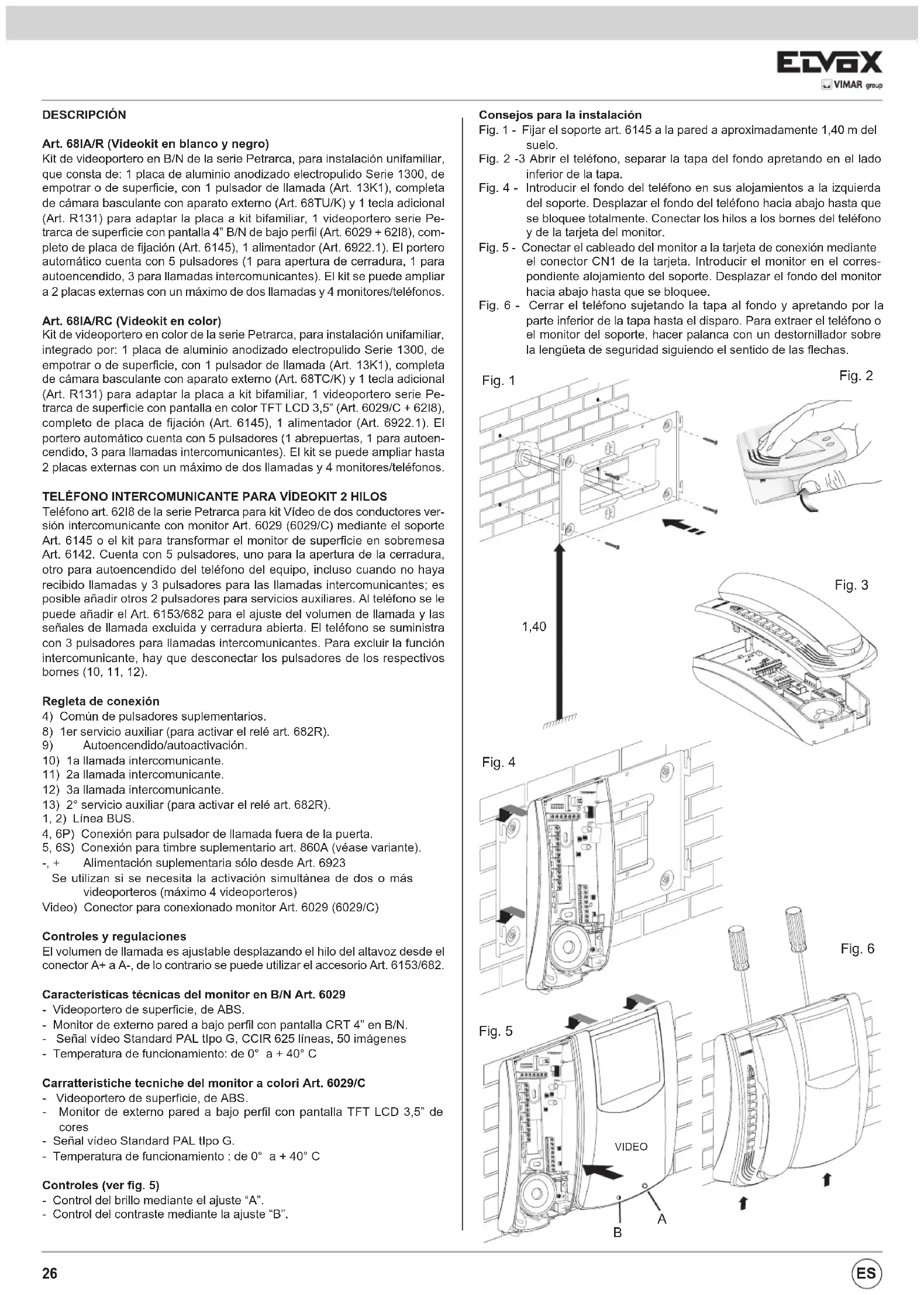 1, 2) Línea BUS. 4, 6P) Conexión para pulsador de llamada fuera de la puerta. 5, 6S) Conexión para timbre suplementario art. 860A (véase variante). -, + Alimentación suplementaria sólo desde Art. 6923 Se utilizan si se necesita la activación simultánea de dos o más videoporteros (máximo 4 videoporteros) Video) Conector para conexionado monitor Art. 6029 (6029/C) Controles y regulaciones El volumen de llamada es ajustable desplazando el hilo del altavoz desde el conector A+ a A-, de lo contrario se puede utilizar el accesorio Art. 6153/682. Características técnicas del monitor en B/N Art. 6029 - Videoportero de superficie, de ABS. - Monitor de externo pared a bajo perfil con pantalla CRT 4” en B/N. - Señal vídeo Standard PAL tIpo G, CCIR 625 líneas, 50 imágenes - Temperatura de funcionamiento: de 0° a + 40° C Carratteristiche tecniche del monitor a colori Art. 6029/C - Videoportero de superficie, de ABS. - Monitor de externo pared a bajo perfil con pantalla TFT LCD 3,5” de cores - Señal vídeo Standard PAL tIpo G. - Temperatura de funcionamiento : de 0° a + 40° C Controles (ver fig. 5) - Control del brillo mediante el ajuste “A”. - Control del contraste mediante la ajuste “B”. Consejos para la instalación Fig. 1 - Fijar el soporte art. 6145 a la pared a aproximadamente 1,40 m del suelo. Fig. 2 -3 Abrir el teléfono, separar la tapa del fondo apretando en el lado inferior de la tapa. Fig. 4 - Introducir el fondo del teléfono en sus alojamientos a la izquierda del soporte. Desplazar el fondo del teléfono hacia abajo hasta que se bloquee totalmente. Conectar los hilos a los bornes del teléfono y de la tarjeta del monitor. Fig. 5 - Conectar el cableado del monitor a la tarjeta de conexión mediante el conector CN1 de la tarjeta. Introducir el monitor en el corres- pondiente alojamiento del soporte. Desplazar el fondo del monitor hacia abajo hasta que se bloquee. Fig. 6 - Cerrar el teléfono sujetando la tapa al fondo y apretando por la parte inferior de la tapa hasta el disparo. Para extraer el teléfono o el monitor del soporte, hacer palanca con un destornillador sobre la lengüeta de seguridad siguiendo el sentido de las flechas. 1,40 Fig. 1 Fig. 6 Fig. 4 Fig. 5 VIDEO