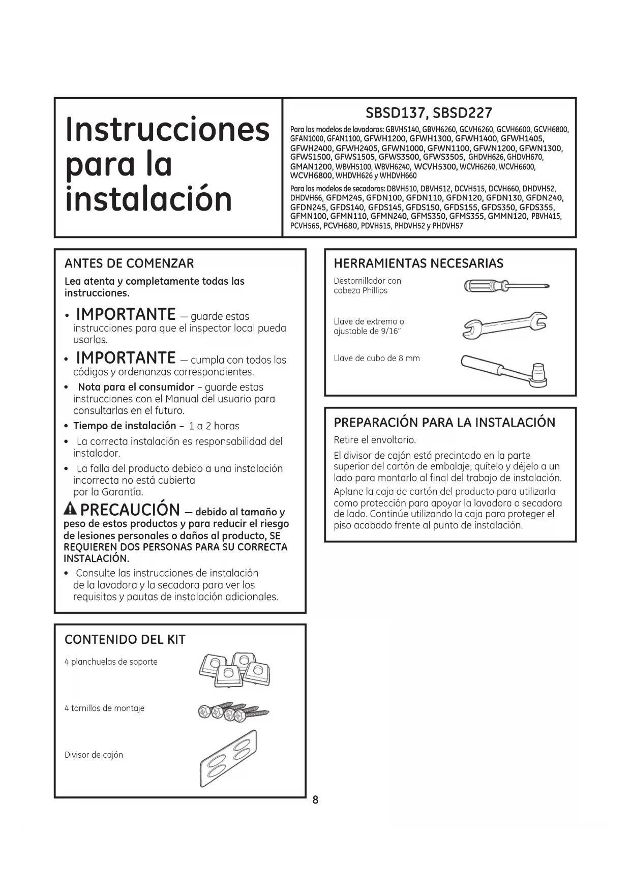 IMPORTANTE ³FXPSODFRQWRGRVORV FyGLJRV\RUGHQDQ]DVFRUUHVSRQGLHQWHV• Nota para el consumidor ²JXDUGHHVWDVinstrucciones con el Manual del usuario para consultarlas en el futuro.• Tiempo de instalación – 1 a 2 horas• La correcta instalación es responsabilidad del instalador. • La falla del producto debido a una instalación incorrecta no está cubierta por la Garantía. PRECAUCIÓN ³GHELGRDOWDPDxR\ peso de estos productos y para reducir el riesgo GHOHVLRQHVSHUVRQDOHVRGDxRVDOSURGXFWR6(REQUIEREN DOS PERSONAS PARA SU CORRECTA INSTALACIÓN.• Consulte las instrucciones de instalación GHODODYDGRUD\ODVHFDGRUDSDUDYHUORVUHTXLVLWRV\SDXWDVGHLQVWDODFLyQDGLFLRQDOHV SBSD1376%6' HERRAMIENTAS NECESARIAS Destornillador con FDEH]D3KLOOLSVLlave de extremo o ajustable de 9/16” Llave de cubo de 8 mm