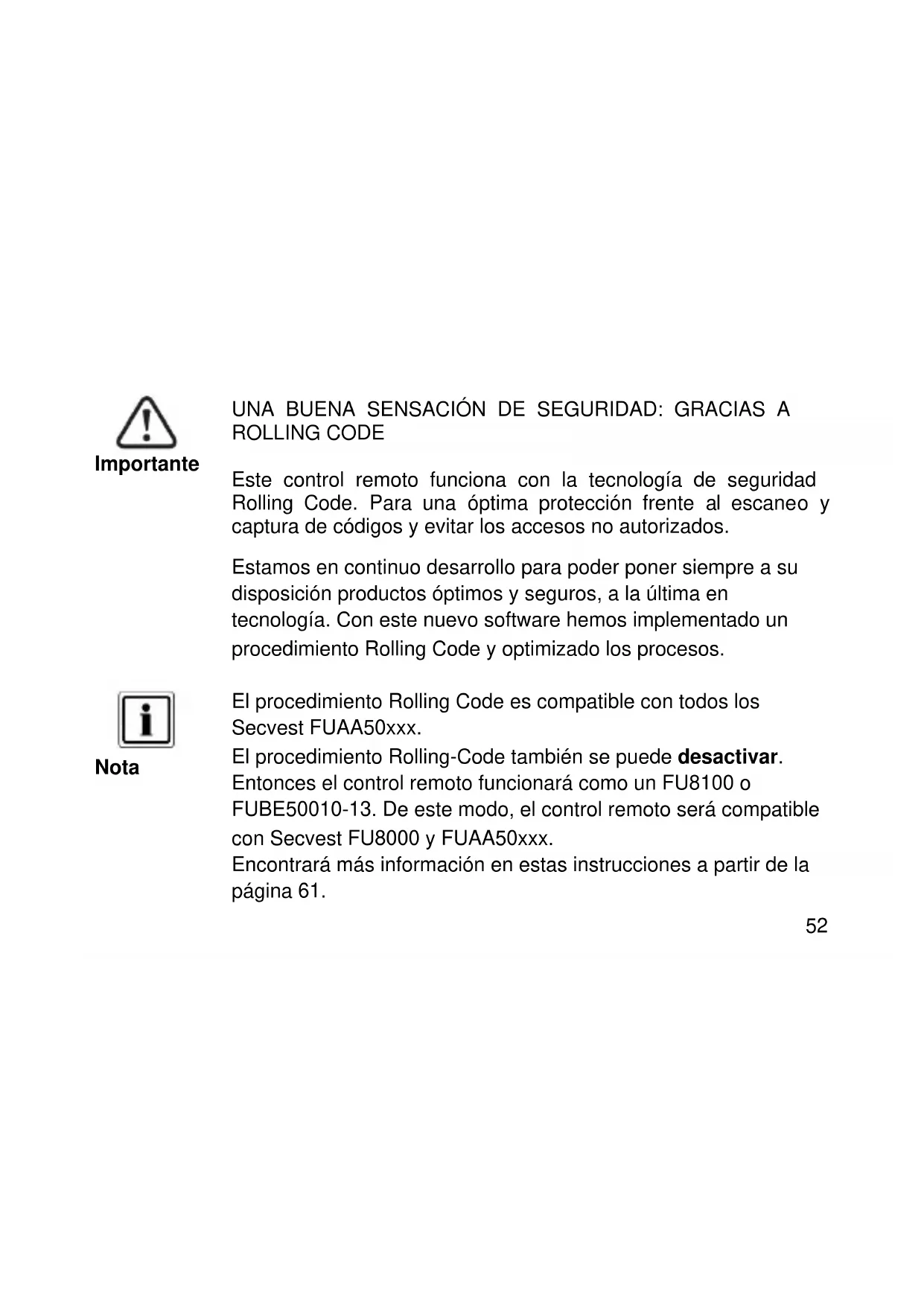 Importante UNA BUENA SENSACIÓN DE SEGURIDAD: GRACIAS A ROLLING CODE Este control remoto funciona con la tecnología de seguridad Rolling Code. Para una óptima protección frente al escaneo y captura de códigos y evitar los accesos no autorizados. Estamos en continuo desarrollo para poder poner siempre a su disposición productos óptimos y seguros, a la última en tecnología. Con este nuevo software hemos implementado un procedimiento Rolling Code y optimizado los procesos.