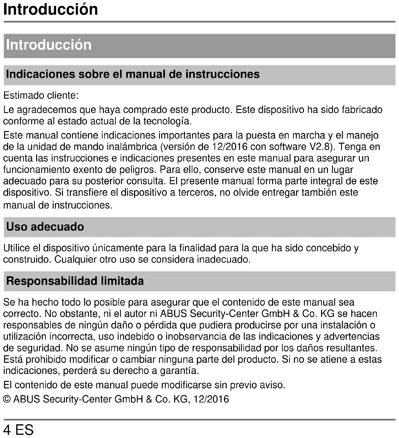 4 ES Introducción Indicaciones sobre el manual de instrucciones Estimado cliente: Le agradecemos que haya comprado este producto. Este dispositivo ha sido fabricado conforme al estado actual de la tecnología. Este manual contiene indicaciones importantes para la puesta en marcha y el manejo de la unidad de mando inalámbrica (versión de 12/2016 con software V2.8). Tenga en cuenta las instrucciones e indicaciones presentes en este manual para asegurar un funcionamiento exento de peligros. Para ello, conserve este manual en un lugar adecuado para su posterior consulta. El presente manual forma parte integral de este dispositivo. Si transfiere el dispositivo a terceros, no olvide entregar también este manual de instrucciones. Uso adecuado Utilice el dispositivo únicamente para la finalidad para la que ha sido concebido y construido. Cualquier otro uso se considera inadecuado. Responsabilidad limitada Se ha hecho todo lo posible para asegurar que el contenido de este manual sea correcto. No obstante, ni el autor ni ABUS Security-Center GmbH & Co. KG se hacen responsables de ningún daño o pérdida que pudiera producirse por una instalación o utilización incorrecta, uso indebido o inobservancia de las indicaciones y advertencias de seguridad. No se asume ningún tipo de responsabilidad por los daños resultantes. Está prohibido modificar o cambiar ninguna parte del producto. Si no se atiene a estas indicaciones, perderá su derecho a garantía. El contenido de este manual puede modificarse sin previo aviso. © ABUS Security-Center GmbH & Co. KG, 12/2016Indicaciones de seguridad
