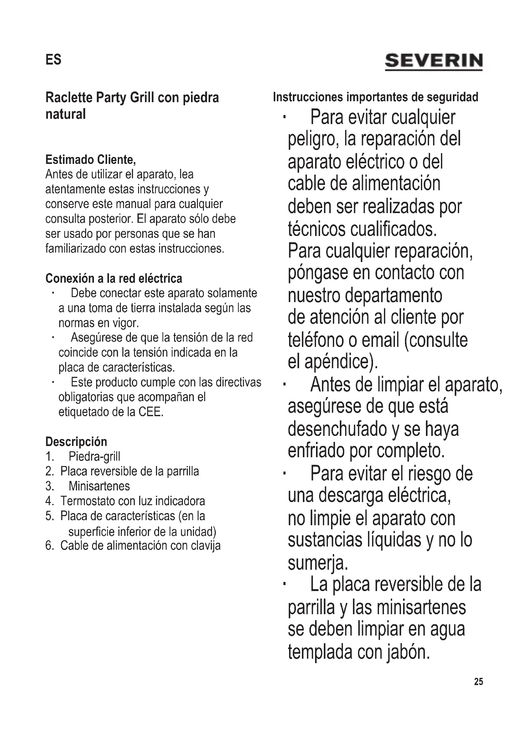 según sea necesario. ∙ Coloque el queso de raclette en las minisartenes. Coloque las minisartenes en el aparato, bajo el elemento térmico, y espere hasta que el queso se derrita. ∙ Advertencia: No coloque las minisartenes vacías en el aparato mientras está encendido. ∙ Después de cocinar los alimentos, gire el termostato hacia la izquierda hasta el máximo y desenchufe el aparato de la red eléctrica. Modo de preparación del queso en raclette Utilice unos 200-300 gr. de queso por persona. Prepare el queso en lonchas de unos 3-5 mm de grosor y colóquelas en las minisartenes. Es preferible utilizar un queso apropiado para fundir. Consejos prácticos ∙ Los alimentos congelados deben descongelarse previamente para su cocción posterior. ∙ Para no dañar el recubrimiento de la placa reversible de la parrilla y las minisartenes, utilice solo utensilios no abrasivos. ∙ Cuando se preparen grandes cantidades de alimentos, la grasa acumulada se deberá retirar con frecuencia; utilice papel de cocina o un producto similar. Limpieza y mantenimiento ∙ Antes de limpiar el aparato, asegúrese siempre de que está desenchufado y se ha enfriado por completo. ∙ Para evitar el riesgo de una descarga eléctrica, no limpie el aparato con sustancias líquidas y no lo sumerja. ∙ No use detergentes abrasivos. ∙ Limpie la carcasa con un paño húmedo. ∙ Después de cocinar, retire las sartenes y la placa reversible de la parrilla, y enjuáguelas en agua caliente. Si fuera necesario, puede utilizar un detergente suave. Seque por completo con un paño suave. ∙ Antes de extraer la piedra para su limpieza, asegúrese de que se haya enfriado por completo. Limpie la piedra con una esponja sintética bajo el chorro de agua sin utilizar ningún detergente. Después séquela por completo con un paño suave. No sumerja la piedra en agua. Eliminación Los dispositivos en los que gura este símbolo deben ser eliminados por separado de la basura doméstica, porque contienen componentes valiosos que pueden ser reciclados. La eliminación correcta ayuda a proteger el medio ambiente y la salud de las personas. Consulte a las autoridades municipales o el establecimiento de venta donde podrán facilitarle la información relevante. Los aparatos eléctricos que ya no son utilizables se pueden entregar gratuitamente en el establecimiento de venta.30 104 x 142 mm Raclette party grill con grill in pietra naturale Gentile Cliente, Prima di utilizzare l’apparecchio, vi raccomandiamo di leggere attentamente le seguenti istruzioni e di conservarle per farvi riferimento anche in futuro. L’apparecchio deve essere utilizzato solo da persone che hanno preso familiarità con le seguenti istruzioni. Collegamento alla rete ∙ L’apparecchio deve essere collegato esclusivamente a una presa di corrente con messa a terra, installata a norma di legge. ∙ Assicuratevi che la tensione di alimentazione corrisponda alla tensione indicata sulla targhetta portadati. ∙ Questo prodotto è conforme alle direttive vincolanti per l’etichettatura CE. Descrizione dell’apparecchio