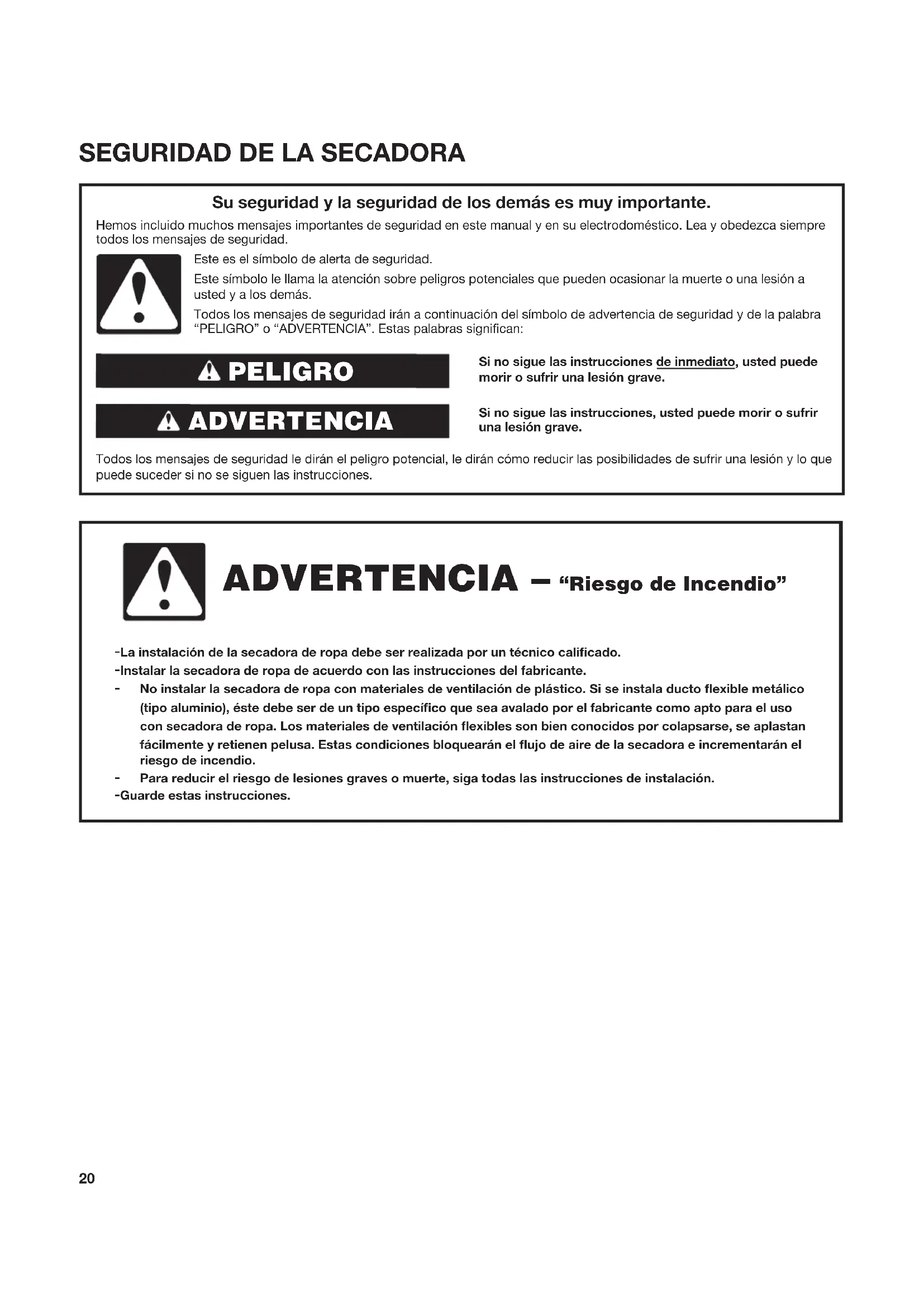 Si no sigue las instrucciones de inmediato, usted puede morir o sufrir una lesión grave.Si no sigue las instrucciones, usted puede morir o sufrir una lesión grave. Todos los mensajes de seguridad le dirán el peligro potencial, le dirán cómo reducir las posibilidades de sufrir una lesión y lo que puede suceder si no se siguen las instrucciones. Su seguridad y la seguridad de los demás es muy importante. Hemos incluido muchos mensajes importantes de seguridad en este manual y en su electrodoméstico. Lea y obedezca siempre todos los mensajes de seguridad. ADVERTENCIA PELIGRO Este es el símbolo de alerta de seguridad.Este símbolo le llama la atención sobre peligros potenciales que pueden ocasionar la muerte o una lesión a usted y a los demás.Todos los mensajes de seguridad irán a continuación del símbolo de advertencia de seguridad y de la palabra “PELIGRO” o “ADVERTENCIA”. Estas palabras significan: ADVERTENCIA – “Riesgo de Incendio” - La instalación de la secadora de ropa debe ser realizada por un técnico calicado. - Instalar la secadora de ropa de acuerdo con las instrucciones del fabricante. - No instalar la secadora de ropa con materiales de ventilación de plástico. Si se instala ducto exible metálico (tipo aluminio), éste debe ser de un tipo especíco que sea avalado por el fabricante como apto para el usocon secadora de ropa. Los materiales de ventilación exibles son bien conocidos por colapsarse, se aplastanfácilmente y retienen pelusa. Estas condiciones bloquearán el ujo de aire de la secadora e incrementarán elriesgo de incendio. - Para reducir el riesgo de lesiones graves o muerte, siga todas las instrucciones de instalación. - Guarde estas instrucciones.21