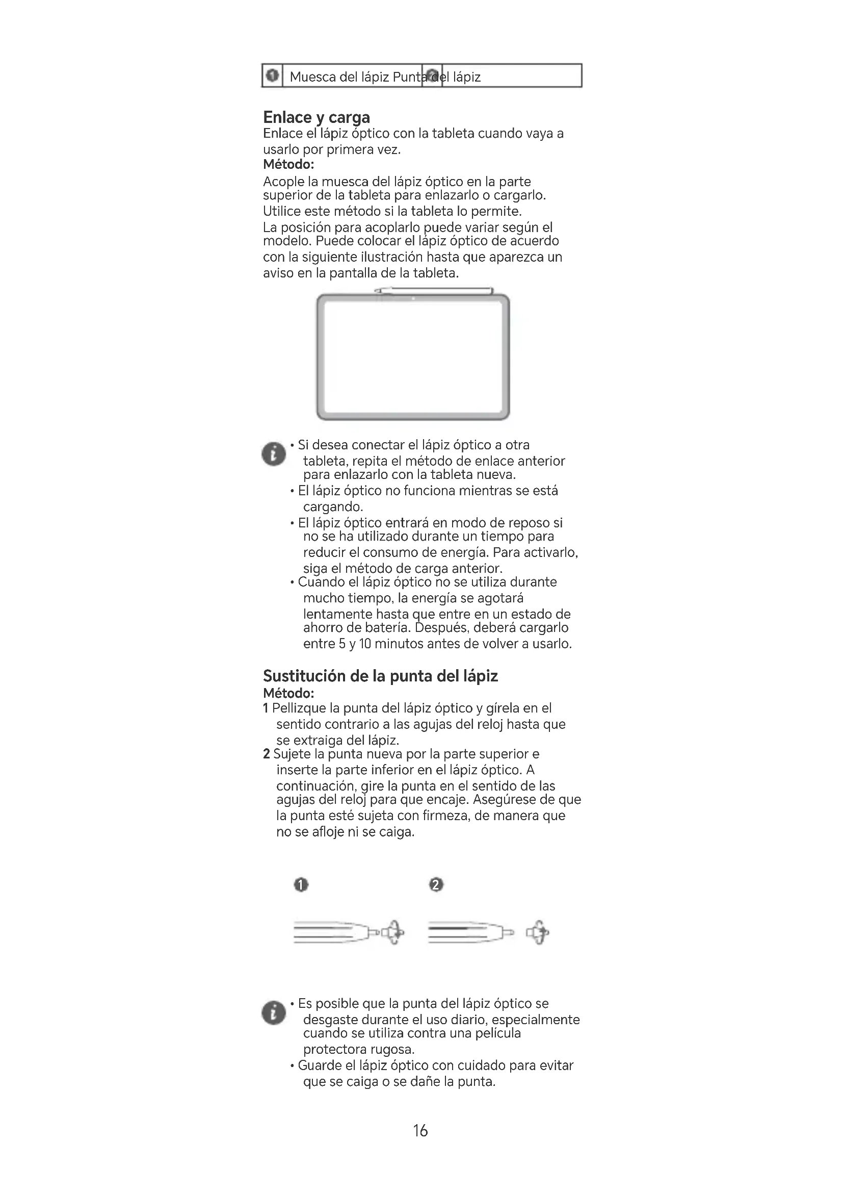 15Muesca del lápiz Punta del lápiz Enlace y carga Enlace el lápiz óptico con la tableta cuando vaya a usarlo por primera vez. Método: Acople la muesca del lápiz óptico en la pae superior de la tableta para enlazarlo o cargarlo. Utilice este método si la tableta lo permite. La posición para acoplarlo puede variar según el modelo. Puede colocar el lápiz óptico de acuerdo con la siguiente ilustración hasta que aparezca un aviso en la pantalla de la tableta.