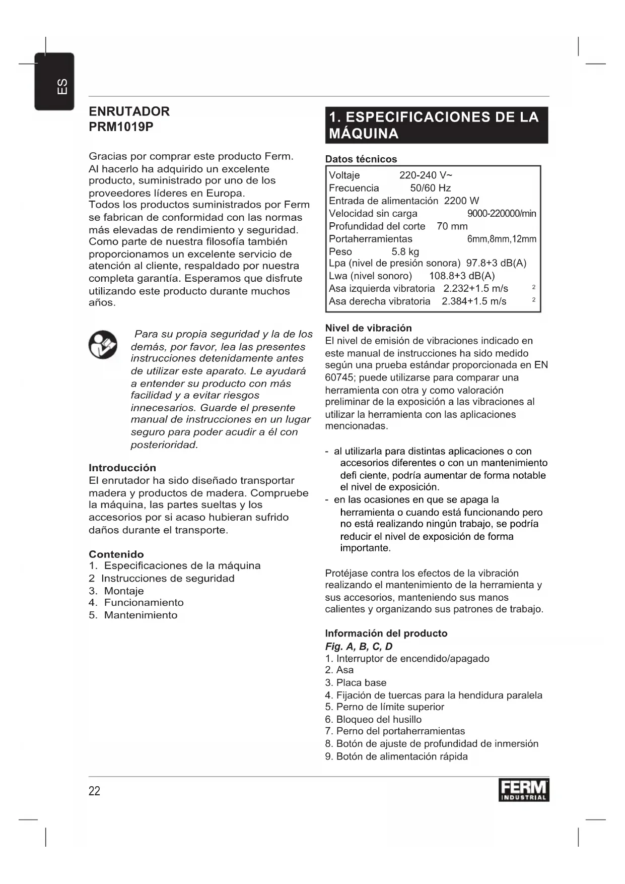 FRENRUTADOR PRM1019P Gracias por comprar este producto Ferm. Al hacerlo ha adquirido un excelente producto, suministrado por uno de los proveedores líderes en Europa. Todos los productos suministrados por Ferm se fabrican de conformidad con las normas más elevadas de rendimiento y seguridad. Como parte de nuestra losofía también proporcionamos un excelente servicio de atención al cliente, respaldado por nuestra completa garantía. Esperamos que disfrute utilizando este producto durante muchos años. Para su propia seguridad y la de los demás, por favor, lea las presentes instrucciones detenidamente antes de utilizar este aparato. Le ayudará a entender su producto con más facilidad y a evitar riesgos innecesarios. Guarde el presente manual de instrucciones en un lugar seguro para poder acudir a él con posterioridad. Introducción El enrutador ha sido diseñado transportar madera y productos de madera. Compruebe la máquina, las partes sueltas y los accesorios por si acaso hubieran sufrido daños durante el transporte. Contenido