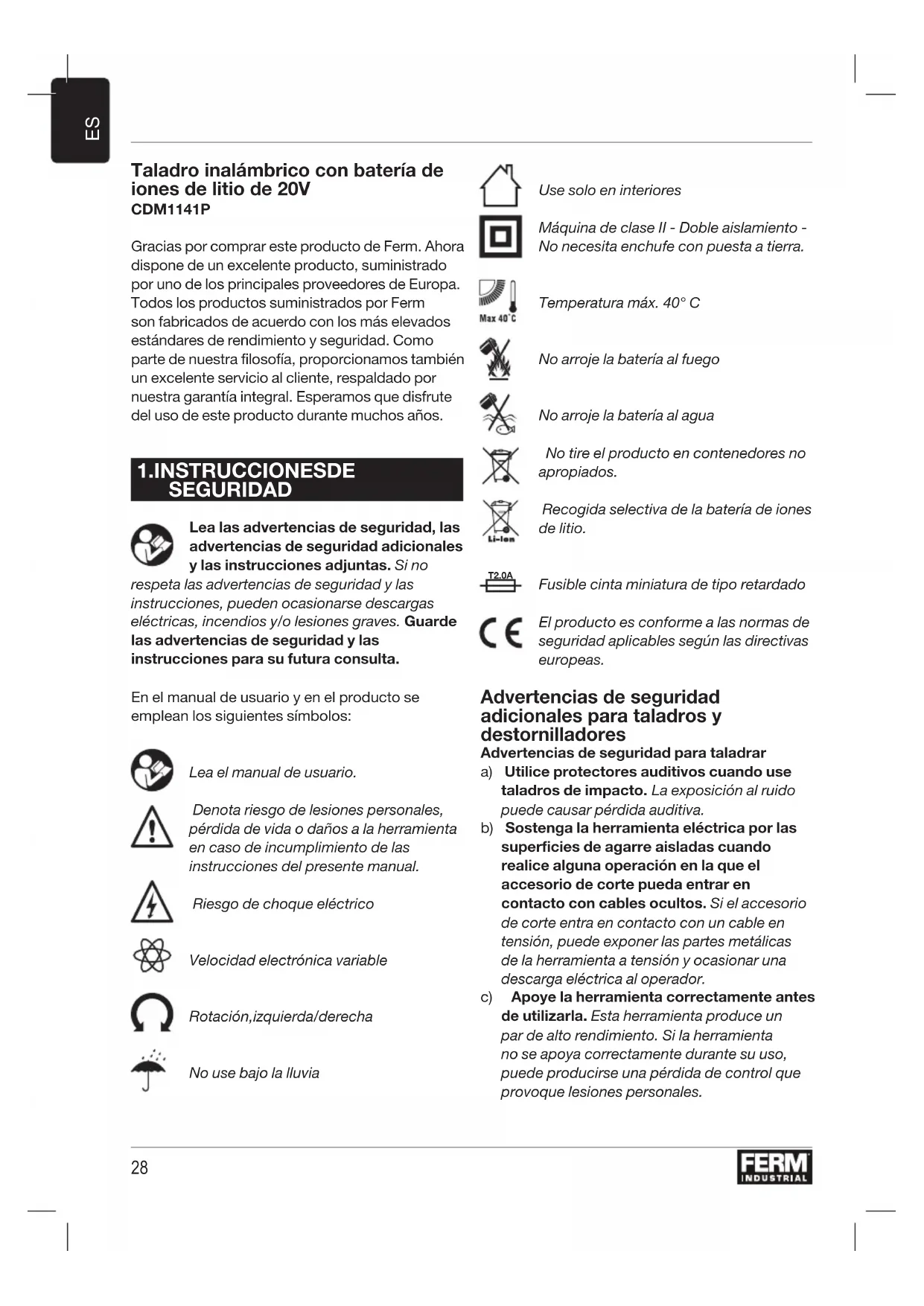 Taladro inalámbrico con batería de iones de litio de 20V CDM1141P Gracias por comprar este producto de Ferm. Ahora dispone de un excelente producto, suministrado por uno de los principales proveedores de Europa. Todos los productos suministrados por Ferm son fabricados de acuerdo con los más elevados estándares de rendimiento y seguridad. Como parte de nuestra filosofía, proporcionamos también un excelente servicio al cliente, respaldado por nuestra garantía integral. Esperamos que disfrute del uso de este producto durante muchos años.