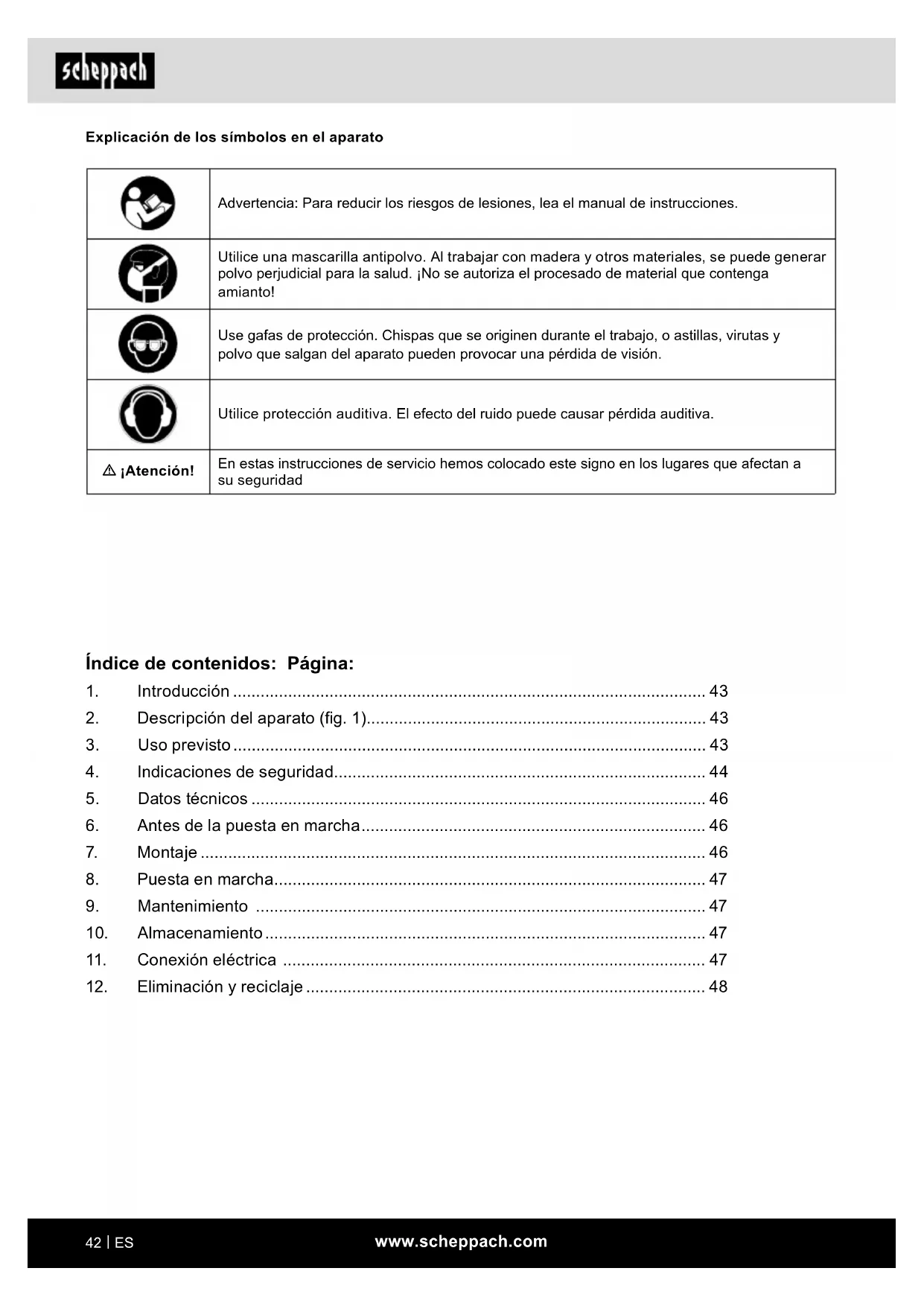 Explicación de los símbolos en el aparato Advertencia: Para reducir los riesgos de lesiones, lea el manual de instrucciones. Utilice una mascarilla antipolvo. Al trabajar con madera y otros materiales, se puede generar polvo perjudicial para la salud. ¡No se autoriza el procesado de material que contenga amianto! Use gafas de protección. Chispas que se originen durante el trabajo, o astillas, virutas y polvo que salgan del aparato pueden provocar una pérdida de visión. Utilice protección auditiva. El efecto del ruido puede causar pérdida auditiva. m ¡Atención! En estas instrucciones de servicio hemos colocado este signo en los lugares que afectan a su seguridad Índice de contenidos: Página: 1. Introducción ....................................................................................................... 43