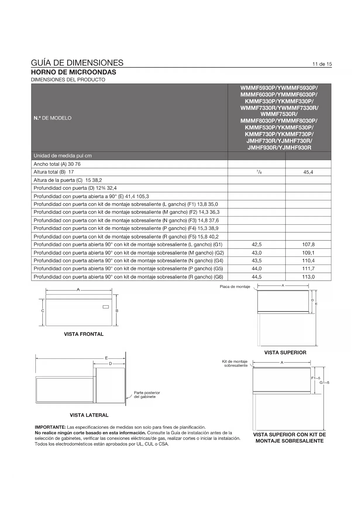 12 de 15IMPORTANTE: Las especicaciones de medidas son solo para nes de planicación.No realice ningún corte basado en esta información. Consulte la Guía de instalación antes de laselección de gabinetes, vericar las conexiones eléctricas/de gas, realizar cortes o iniciar la instalación.Todos los electrodomésticos están aprobados por UL, CUL o CSA.