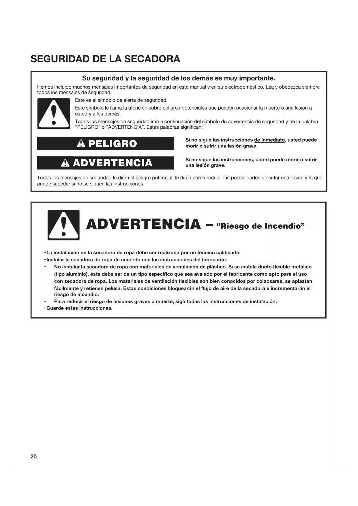 Si no sigue las instrucciones de inmediato, usted puede morir o sufrir una lesión grave.Si no sigue las instrucciones, usted puede morir o sufrir una lesión grave. Todos los mensajes de seguridad le dirán el peligro potencial, le dirán cómo reducir las posibilidades de sufrir una lesión y lo que puede suceder si no se siguen las instrucciones. Su seguridad y la seguridad de los demás es muy importante. Hemos incluido muchos mensajes importantes de seguridad en este manual y en su electrodoméstico. Lea y obedezca siempre todos los mensajes de seguridad. ADVERTENCIA PELIGRO Este es el símbolo de alerta de seguridad.Este símbolo le llama la atención sobre peligros potenciales que pueden ocasionar la muerte o una lesión a usted y a los demás.Todos los mensajes de seguridad irán a continuación del símbolo de advertencia de seguridad y de la palabra “PELIGRO” o “ADVERTENCIA”. Estas palabras significan: ADVERTENCIA – “Riesgo de Incendio” - La instalación de la secadora de ropa debe ser realizada por un técnico calicado. - Instalar la secadora de ropa de acuerdo con las instrucciones del fabricante. - No instalar la secadora de ropa con materiales de ventilación de plástico. Si se instala ducto exible metálico (tipo aluminio), éste debe ser de un tipo especíco que sea avalado por el fabricante como apto para el usocon secadora de ropa. Los materiales de ventilación exibles son bien conocidos por colapsarse, se aplastanfácilmente y retienen pelusa. Estas condiciones bloquearán el ujo de aire de la secadora e incrementarán elriesgo de incendio. - Para reducir el riesgo de lesiones graves o muerte, siga todas las instrucciones de instalación. - Guarde estas instrucciones.21